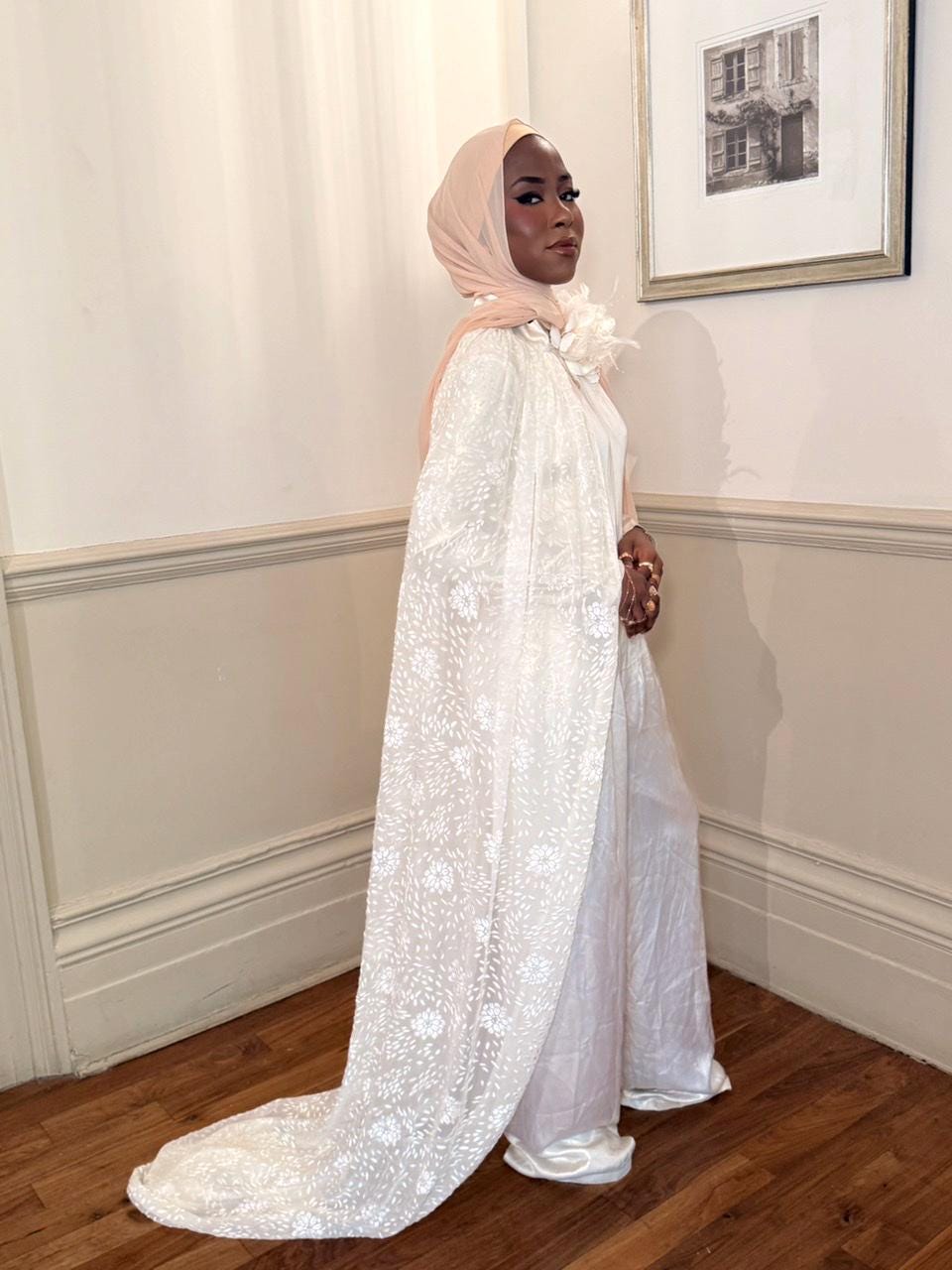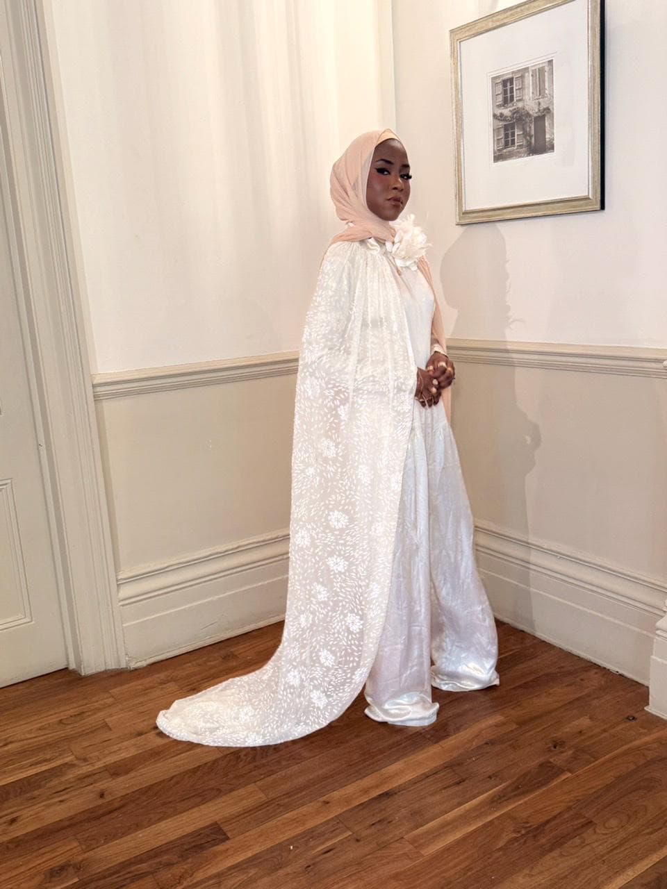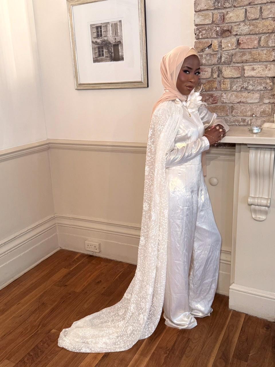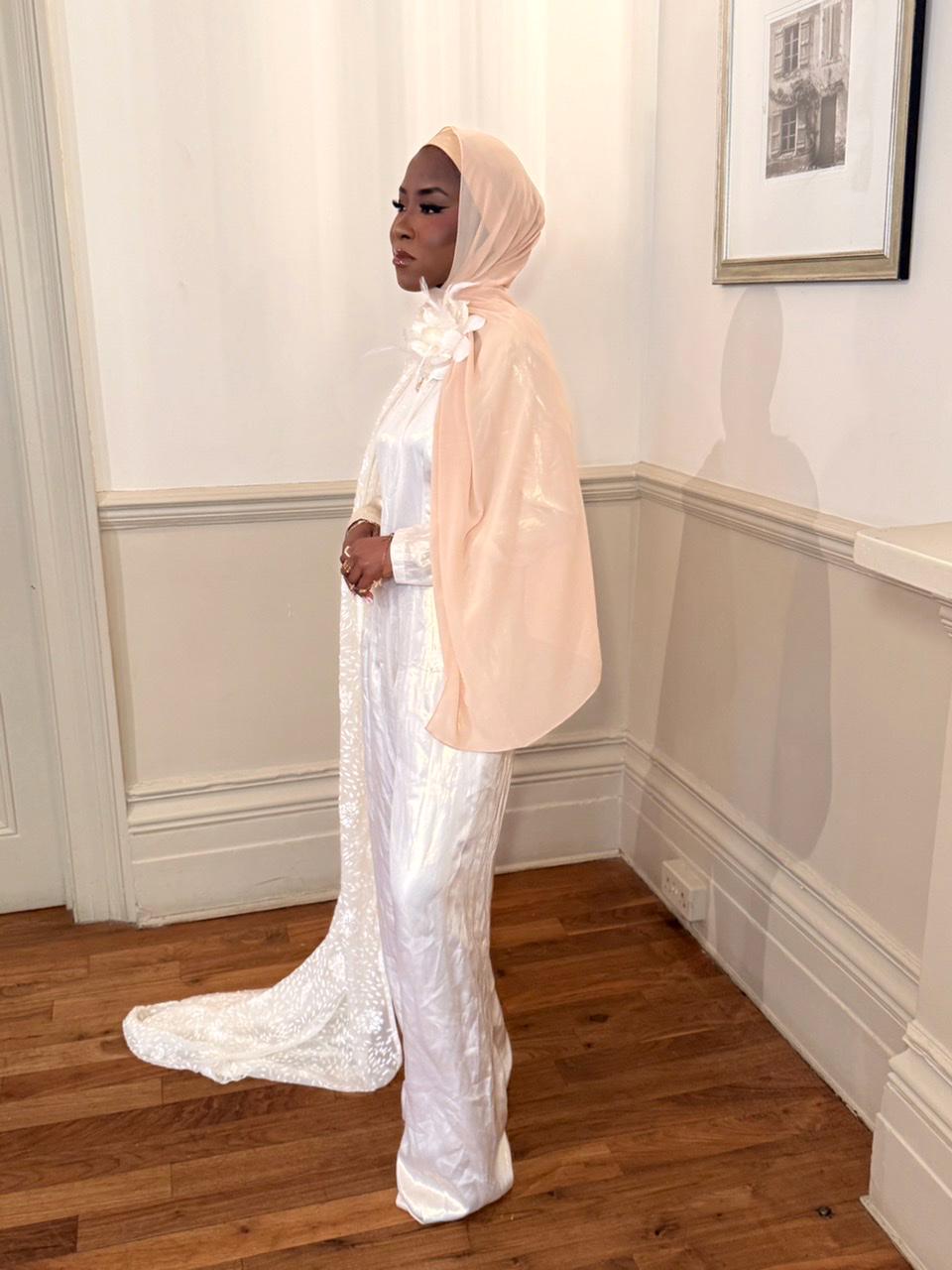 Two piece jump suit, in a creamy satin with see through dress & creamy floral tulle dropped in mermaid style