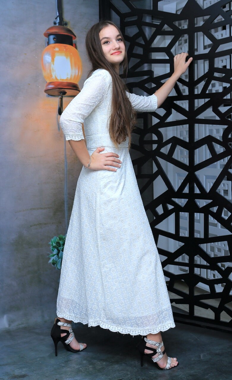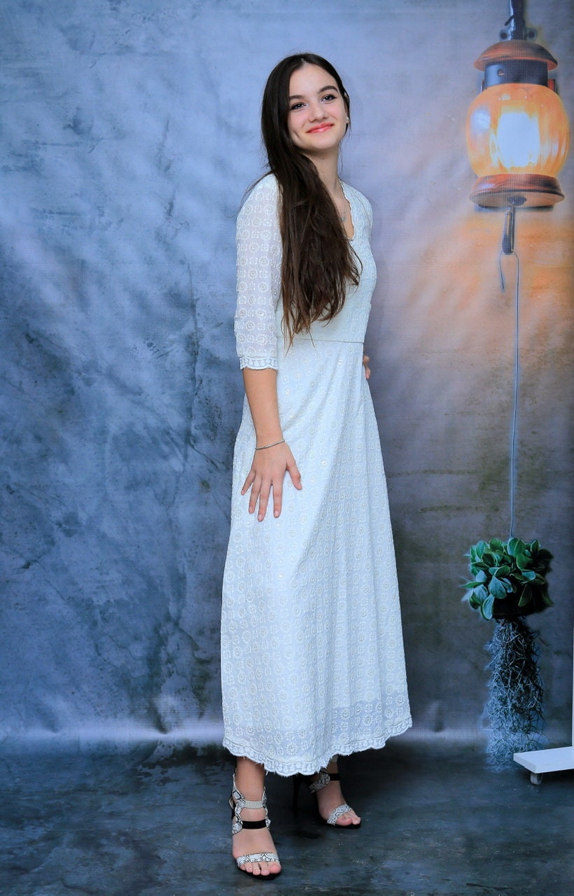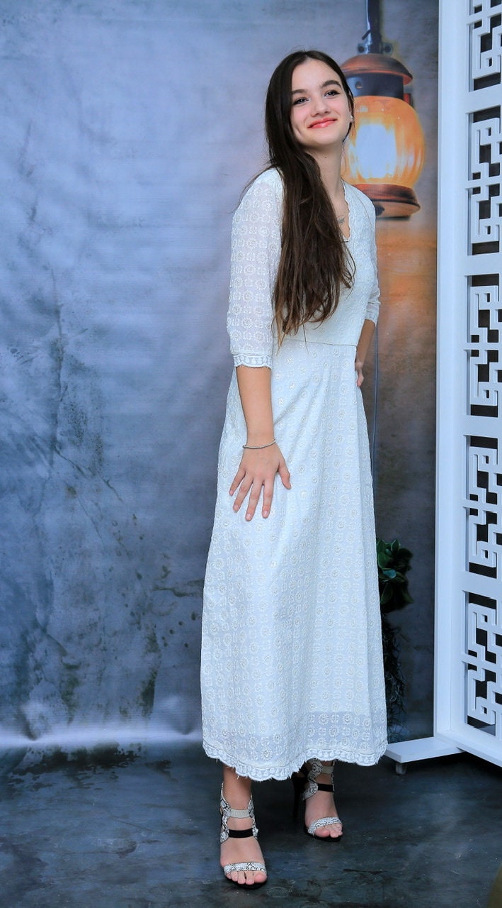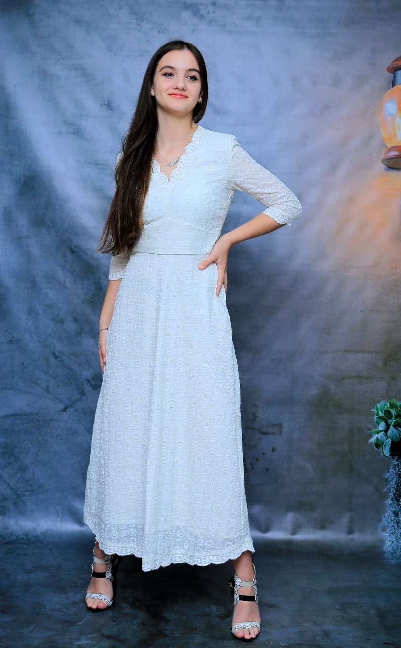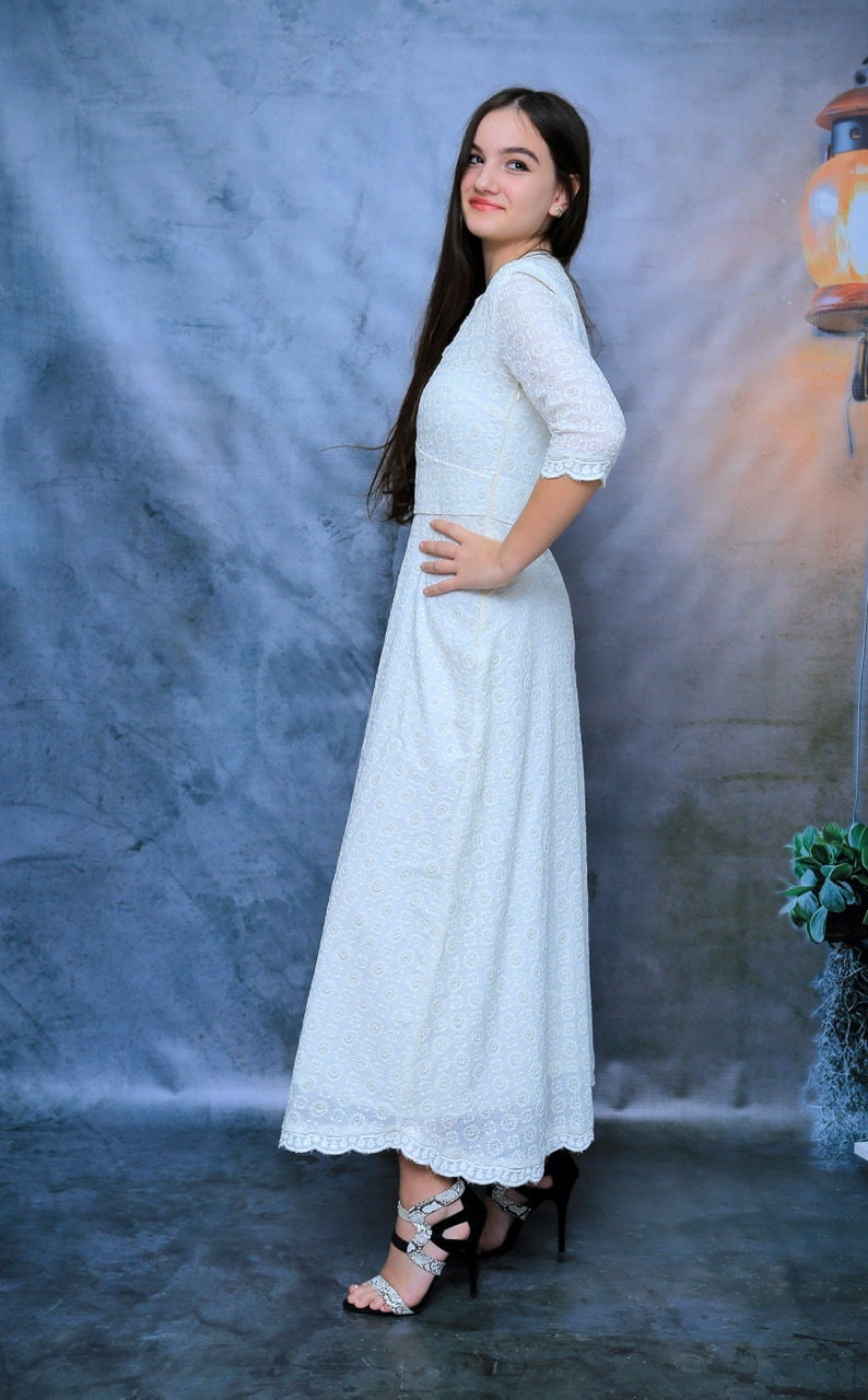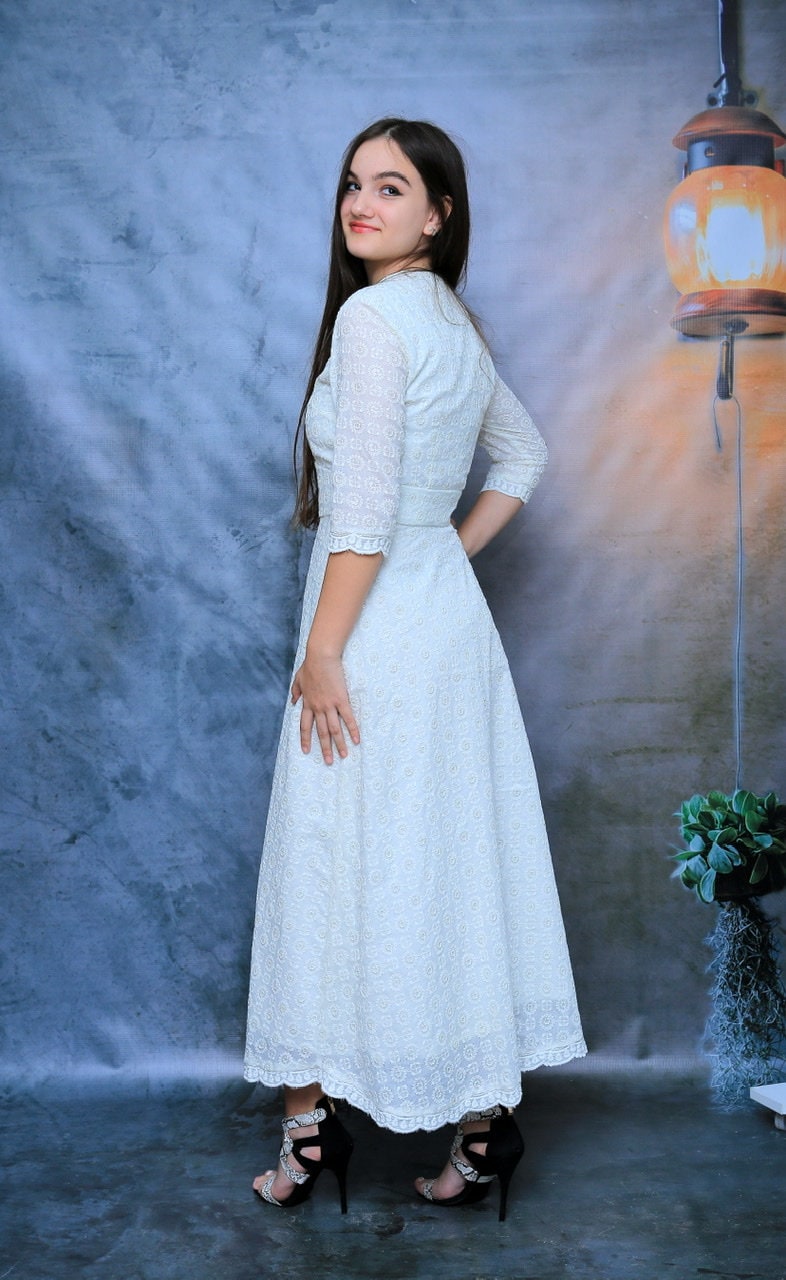 Petite Floral/ Embroidered/ White/ Cotton Dress, Bridal Dress, Ladies White Dress, A-Line Dress, Maxi Dress,