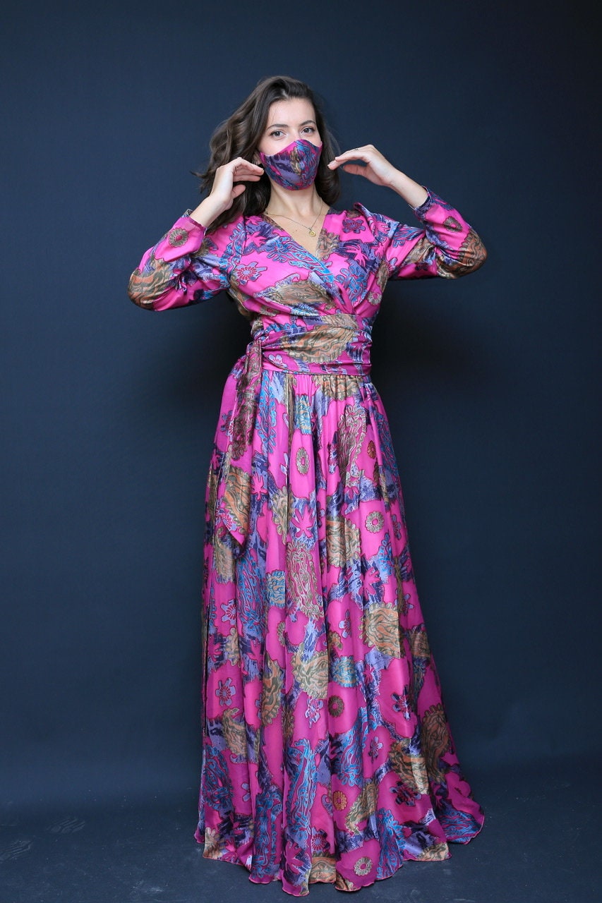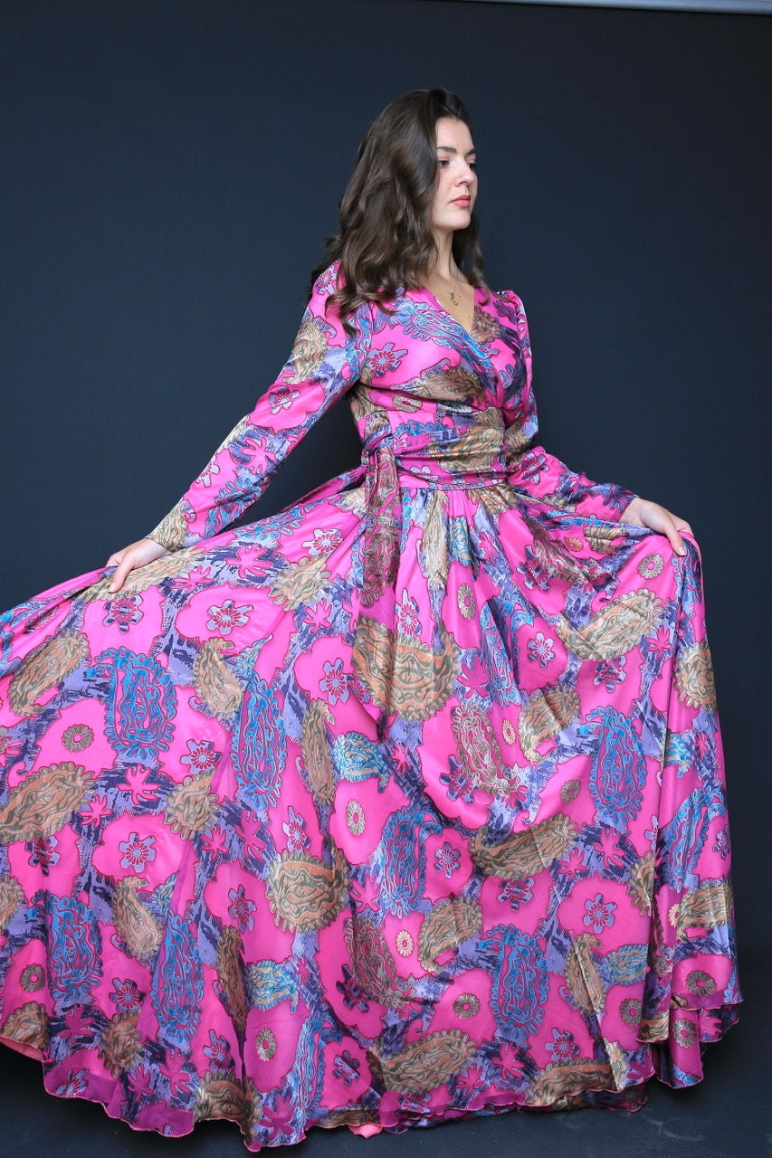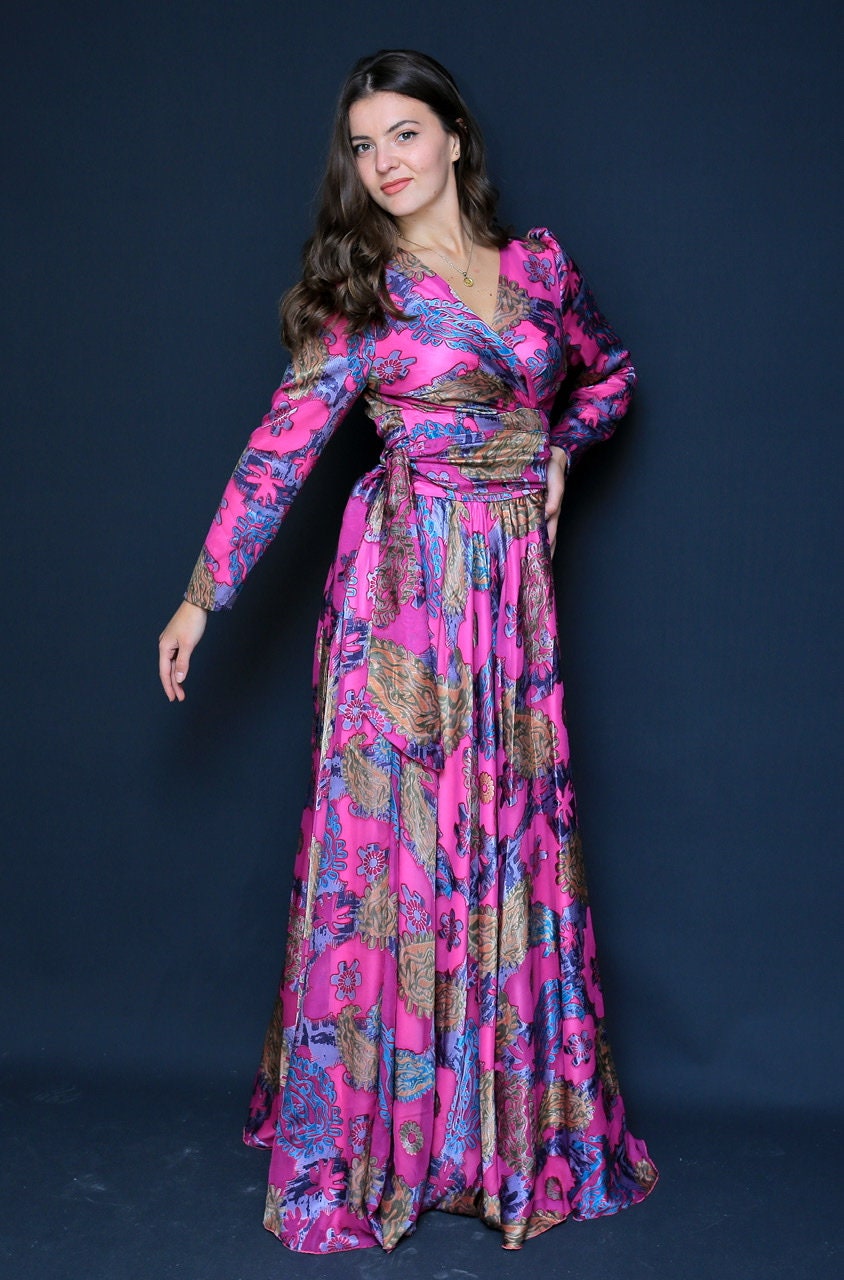Floral Satin/ Long Wrap Dress, Summer Dress, Purple Dress, Bridel Dress, Modest Dress, Pink Satin Dress, Cocktail Party,