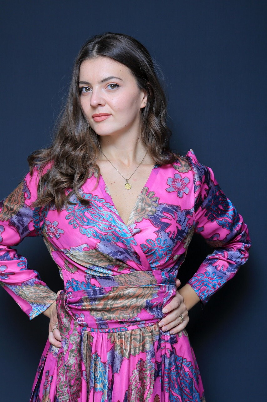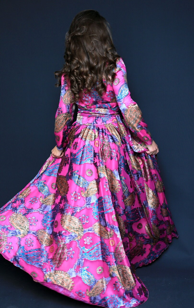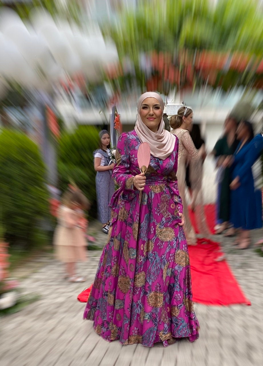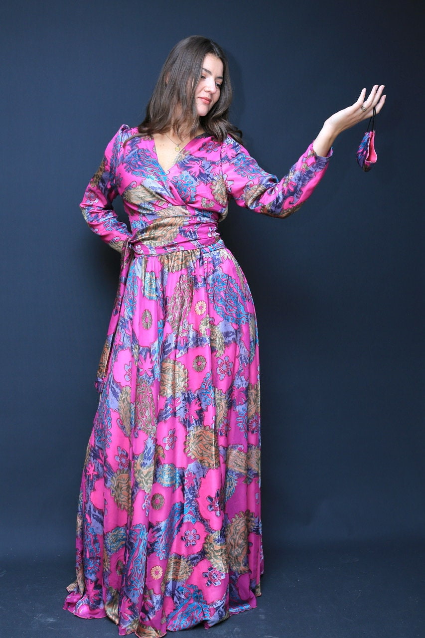 Floral Satin/ Long Wrap Dress, Summer Dress, Purple Dress, Bridel Dress, Modest Dress, Pink Satin Dress, Cocktail Party,
