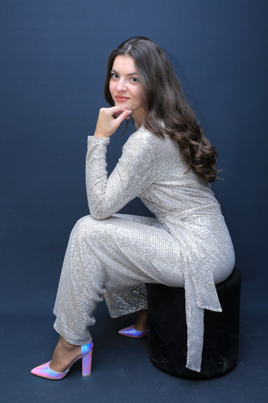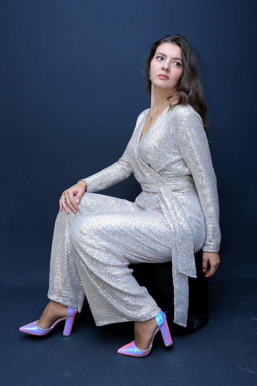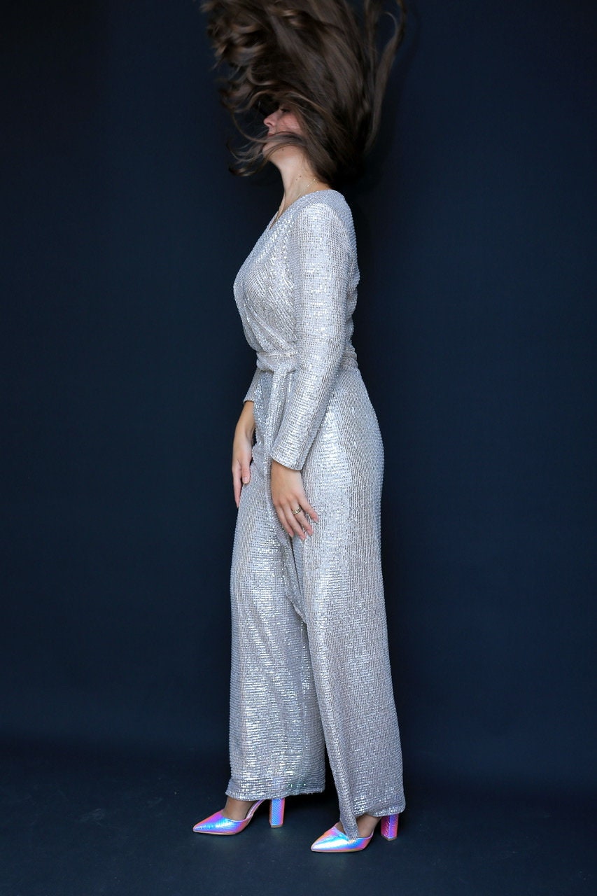 Silver Sequin/ Jumpsuit Romper, jumpsuit, sparkly jumpsuit, party, disco, wide leg jumpsuit, wedding jumpsuit, wrap jumpsuit with belt,