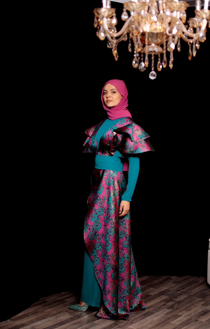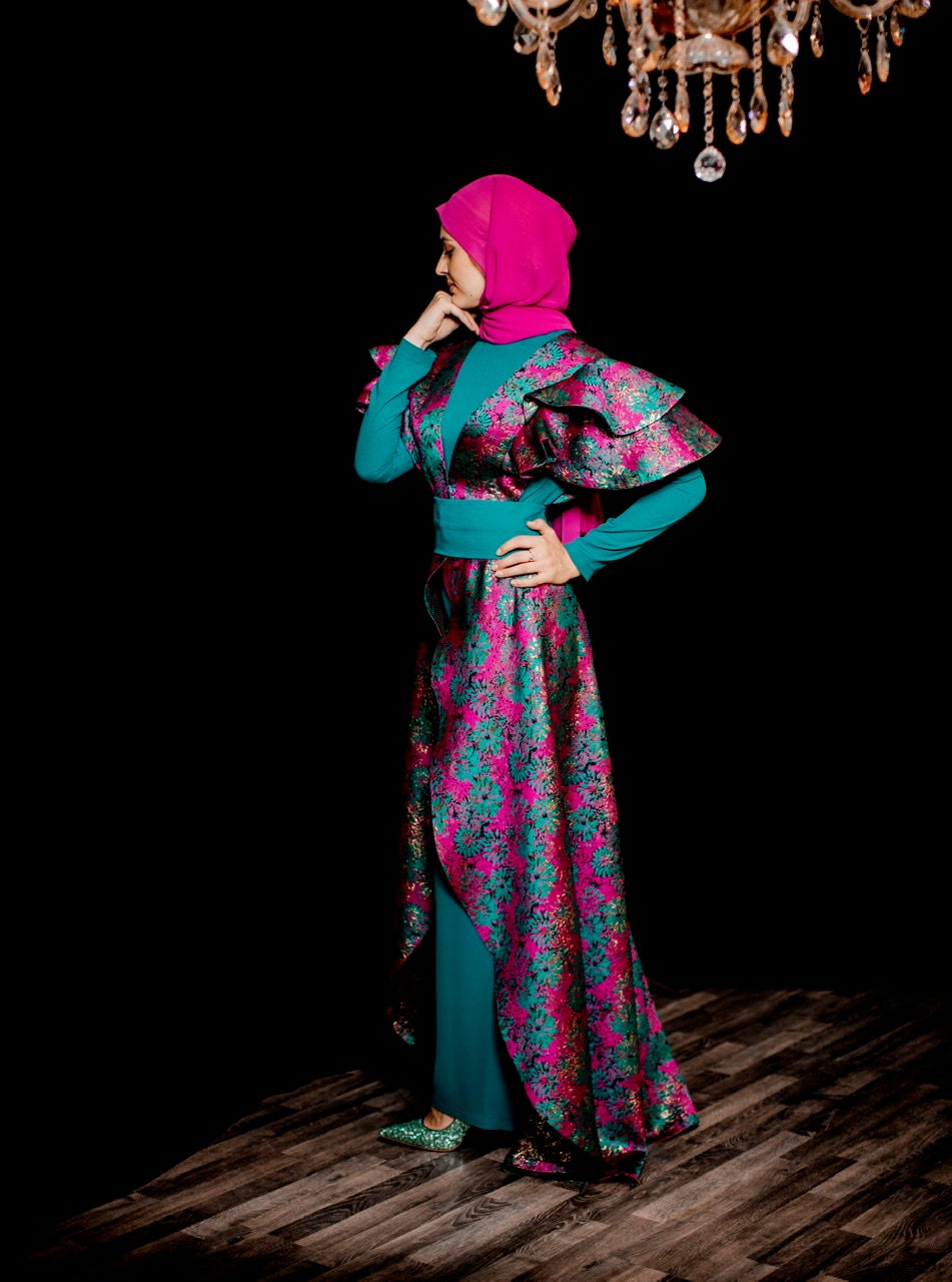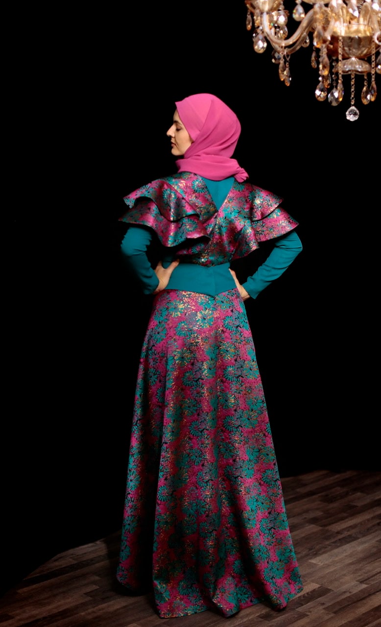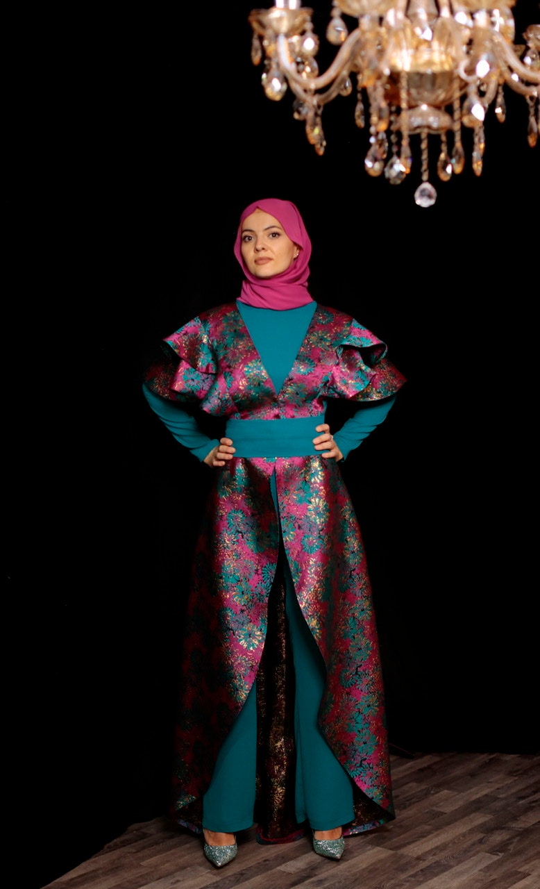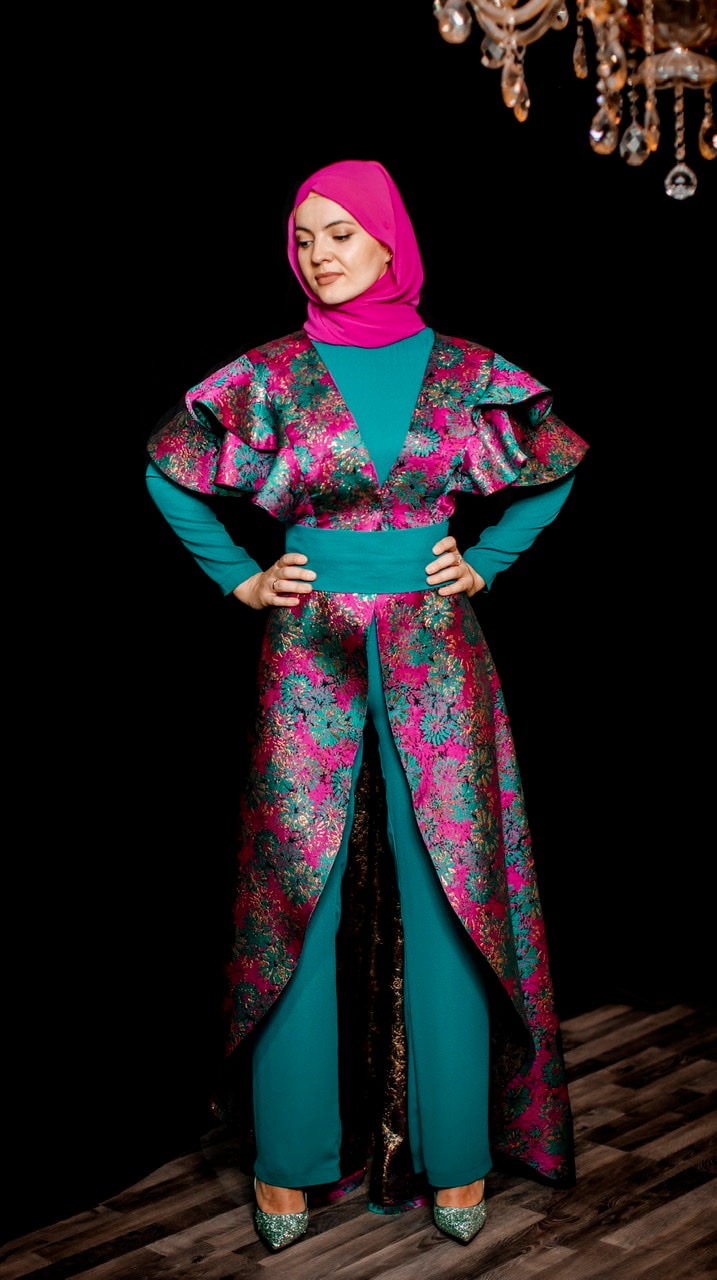 Green & pink two piece jumpsuit in a floral brocade, green belt included.