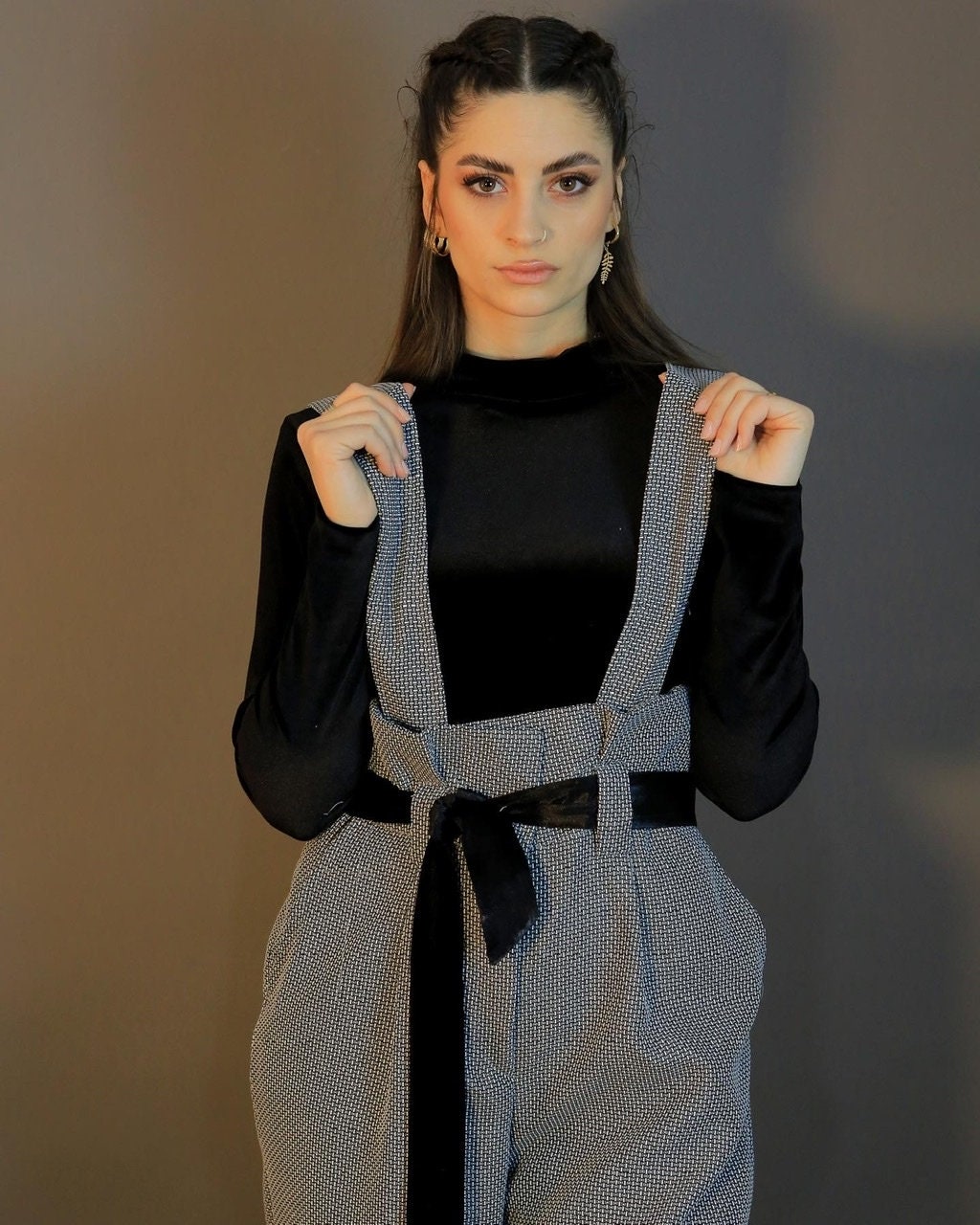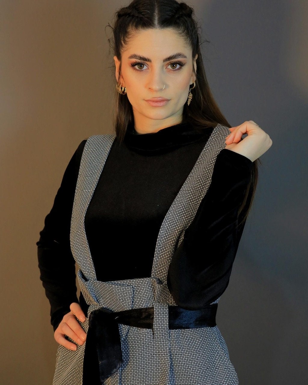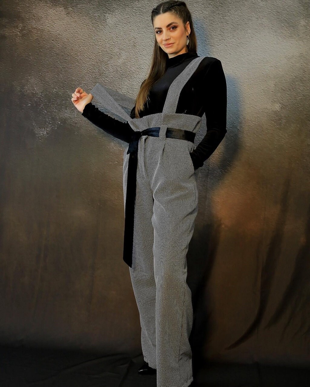 Autumn Jumpsuit in a beautiful grey fabric and black velvet top