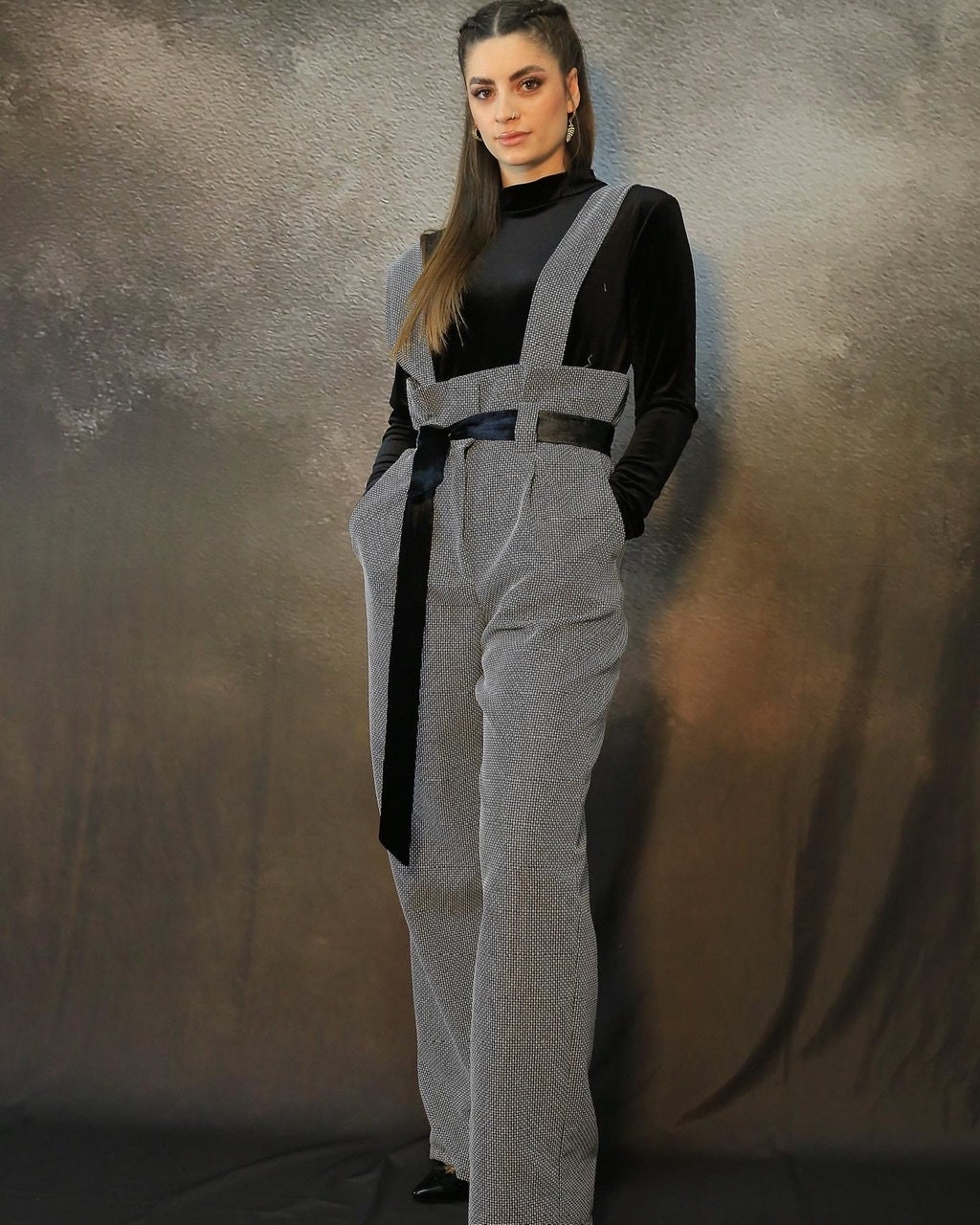Cotton Wool Bland Suiting Jumpsuit / Black Velvet Top/ Grey Jumpsuit/ Two Piece Jumpsuit/ Two Piece Trousers/