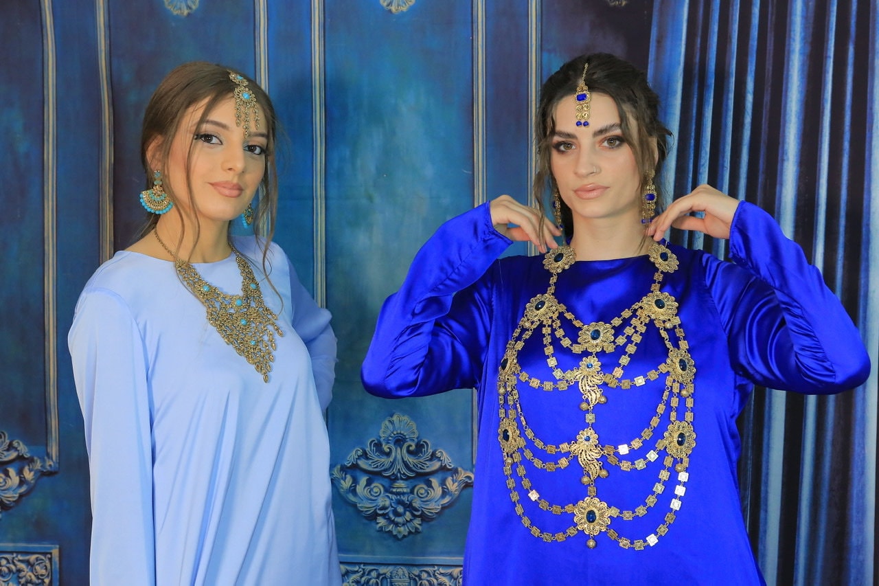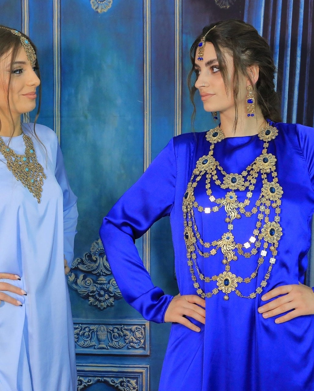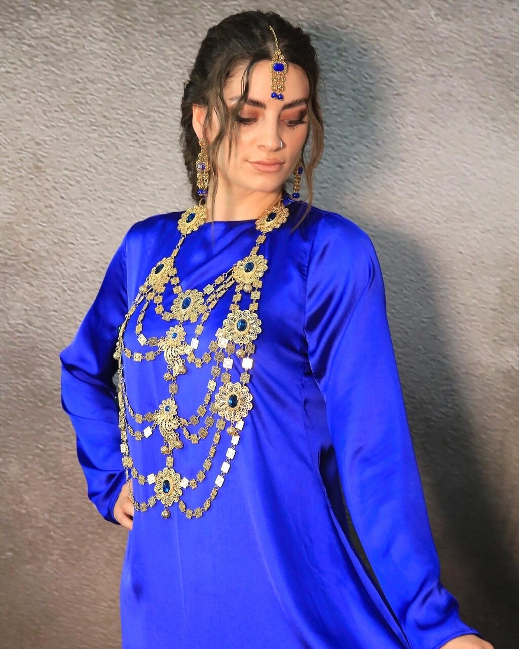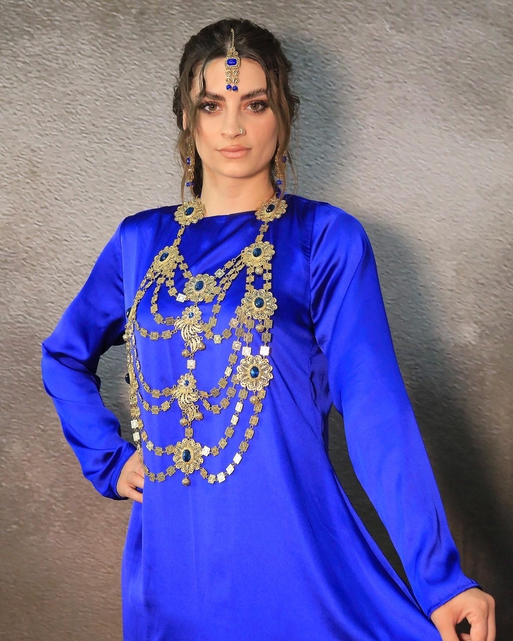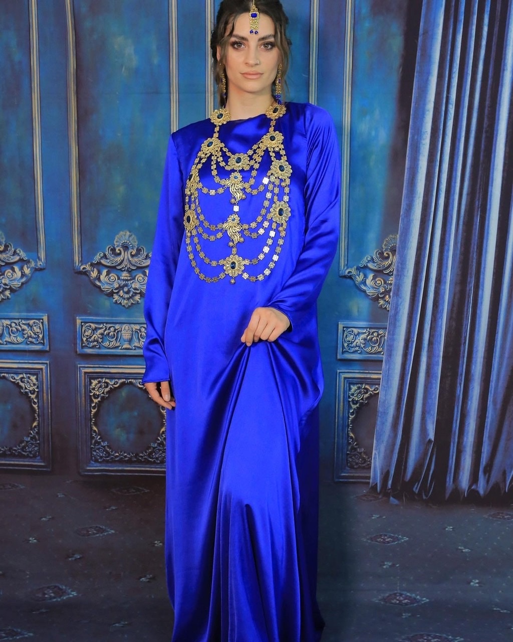 Beautiful royal blue dress in Ottoman style with blue stone & gold necklace jewellery