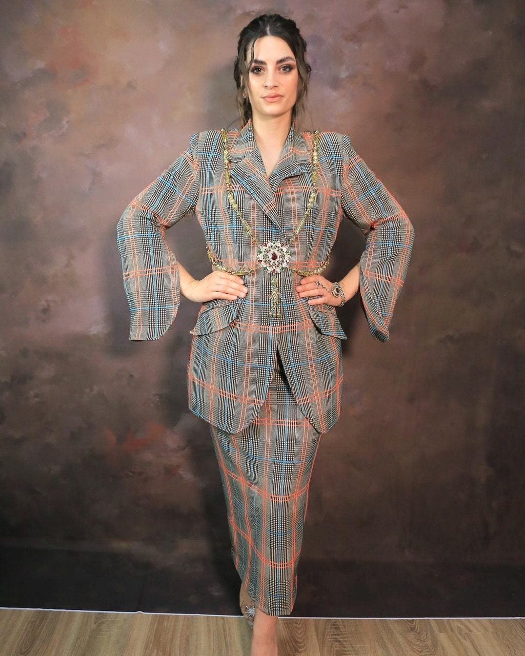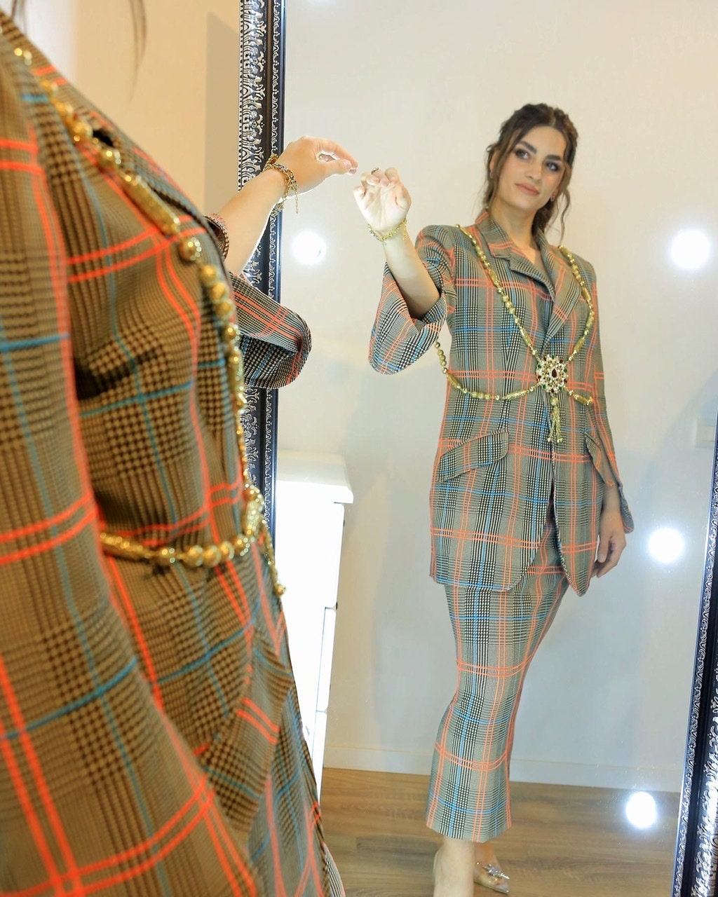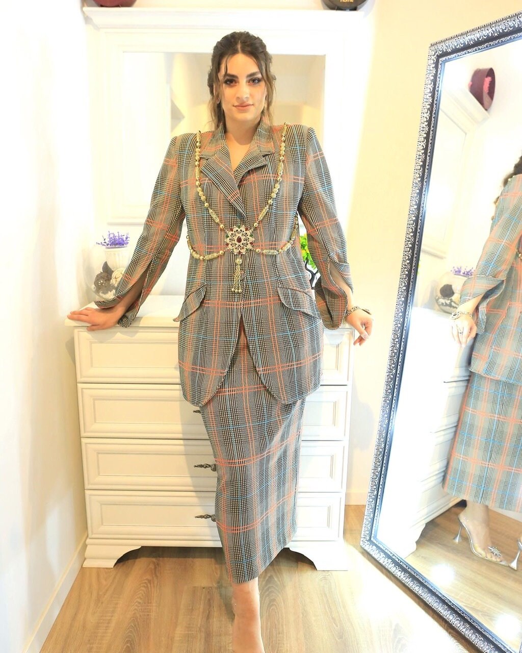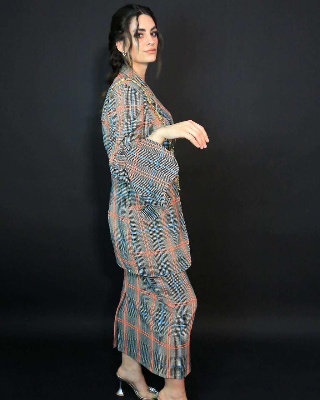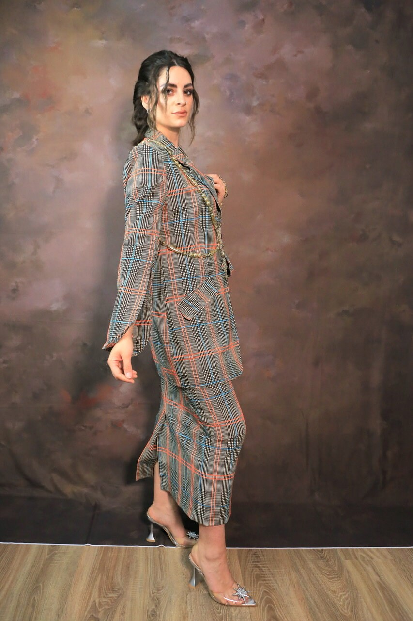 Stunning jacket and skirt in check orange & grey fabric with jewels accessories
