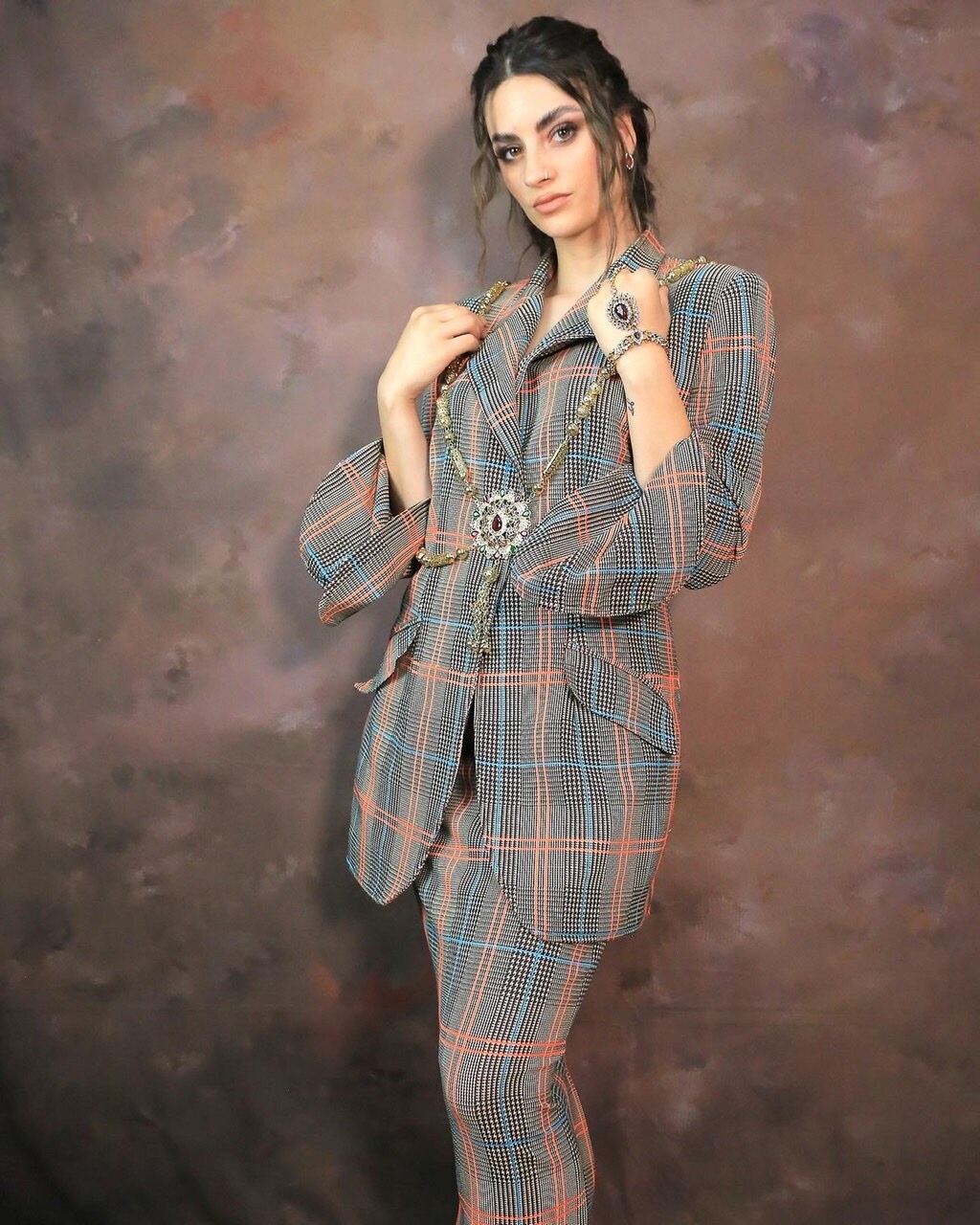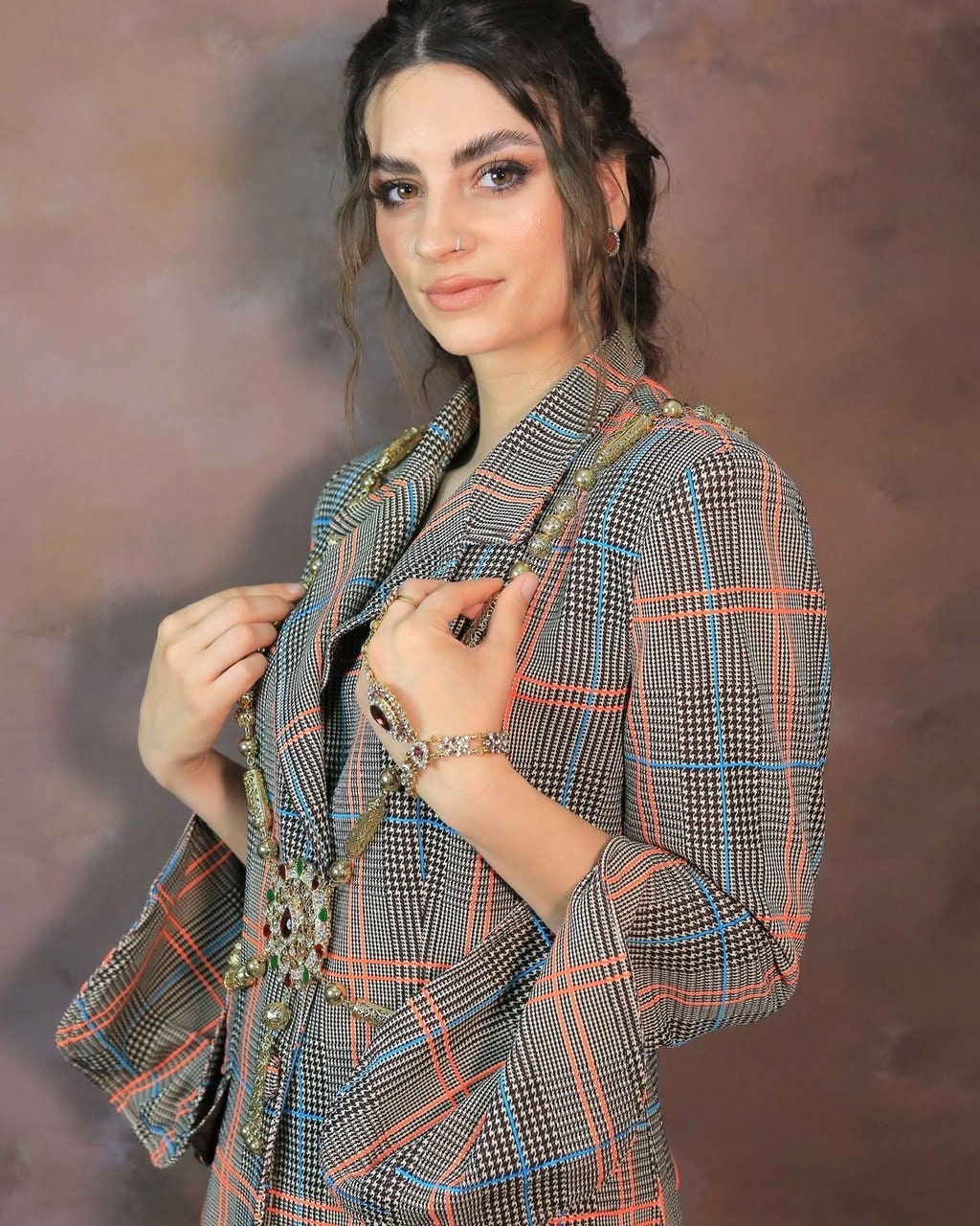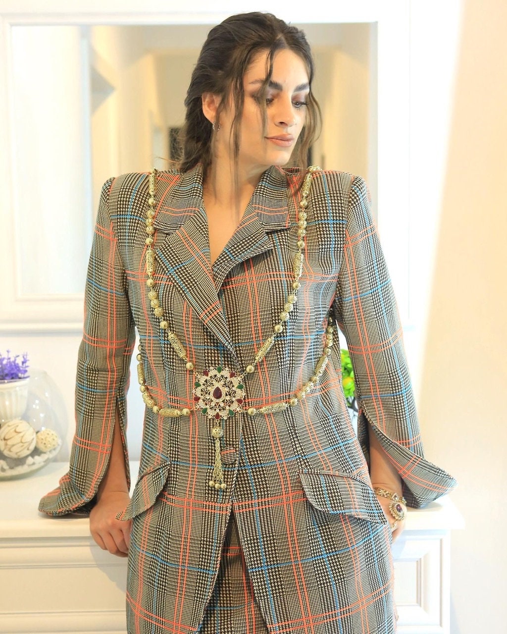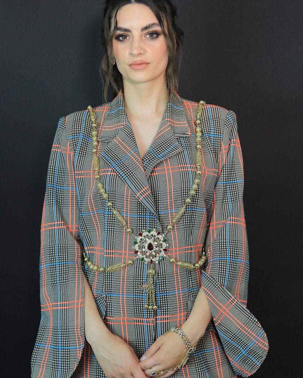 Stunning jacket and skirt in check orange & grey fabric with jewels accessories