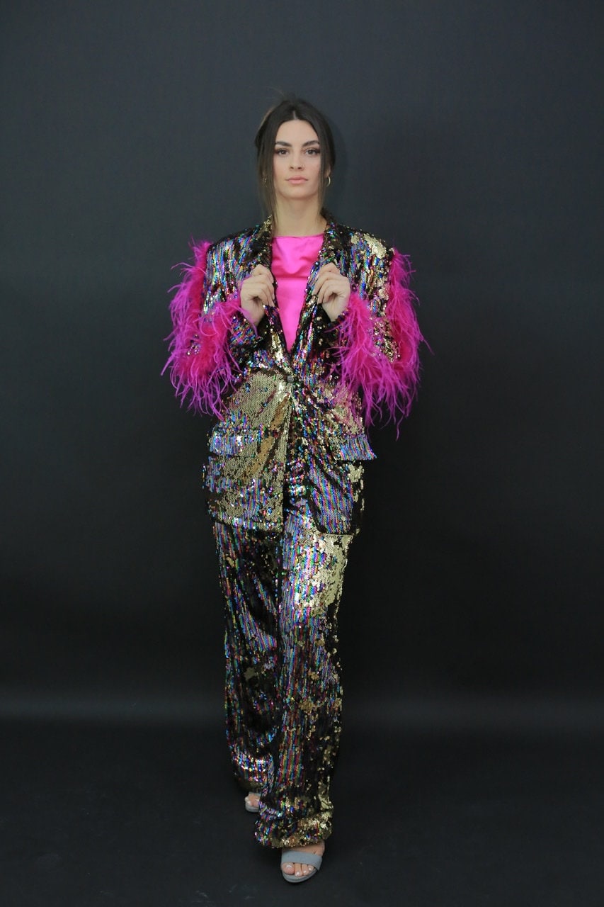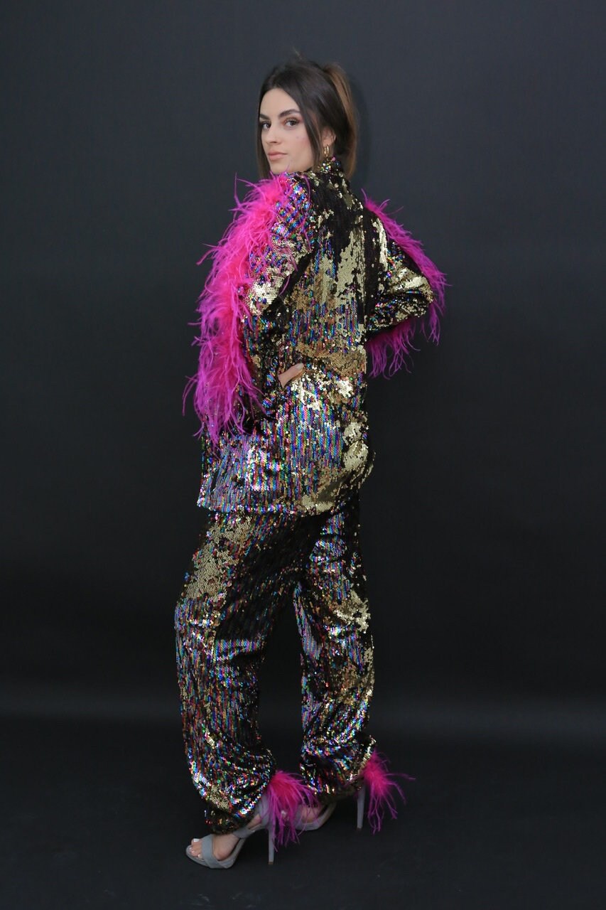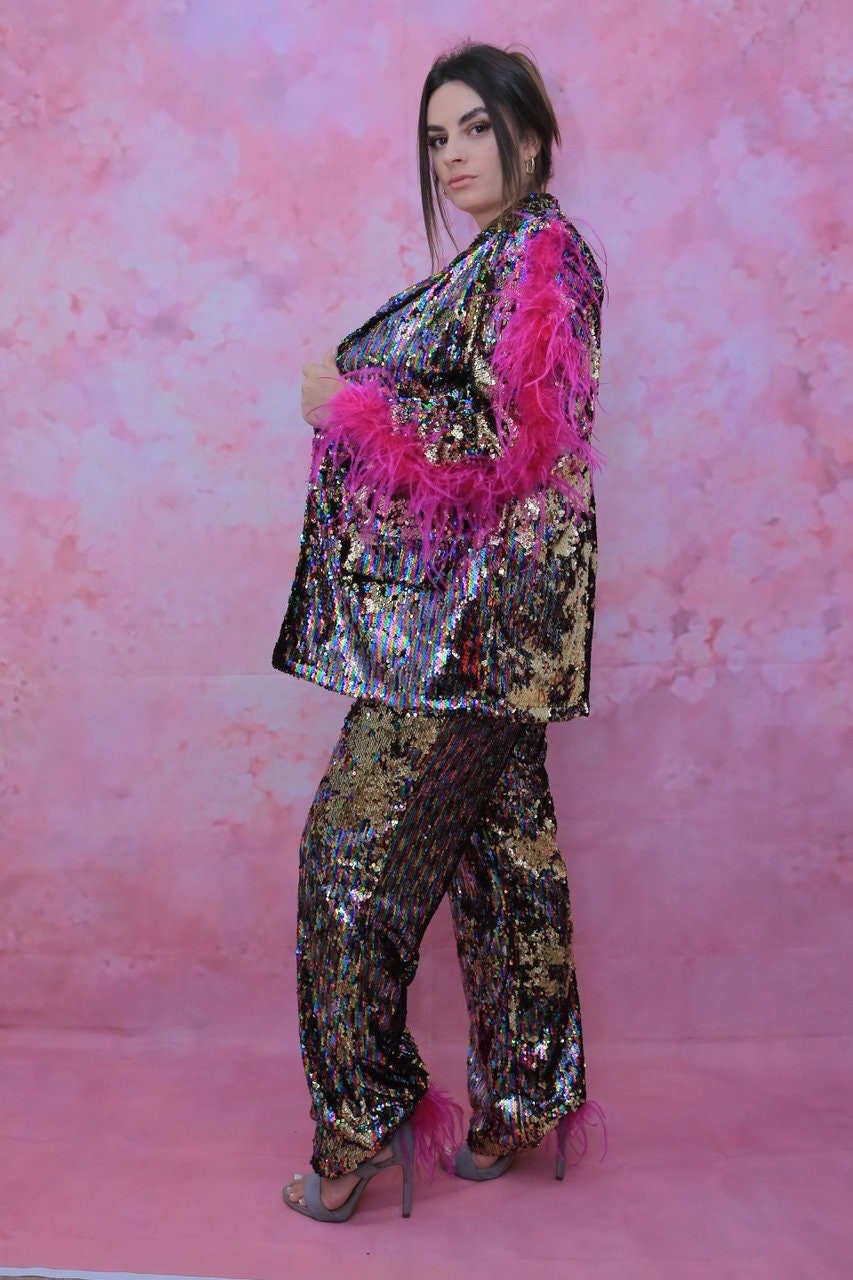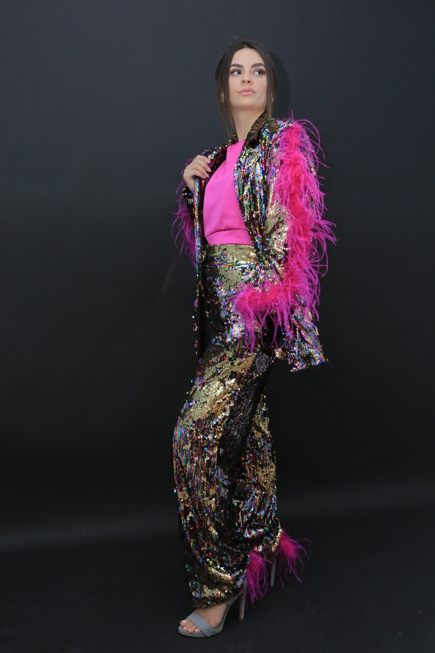 Multicoloured sequin jacket with feathers, trousers and a bright pink under top