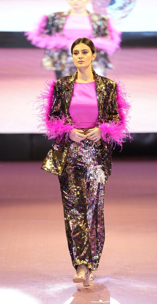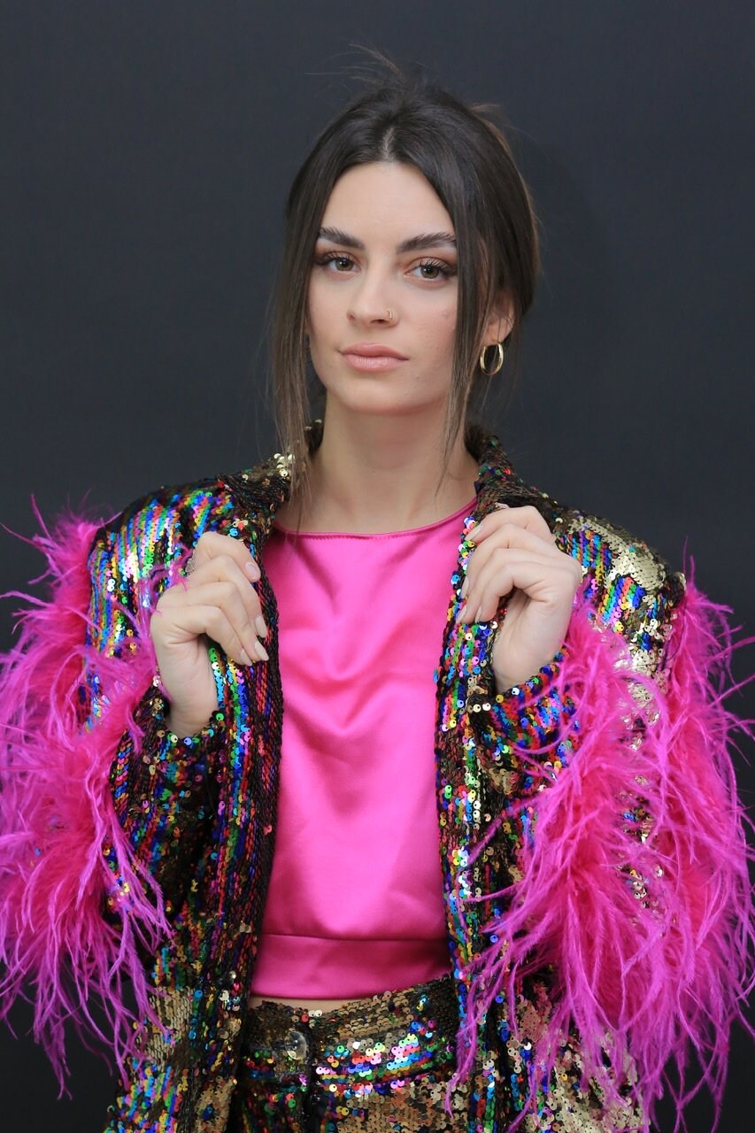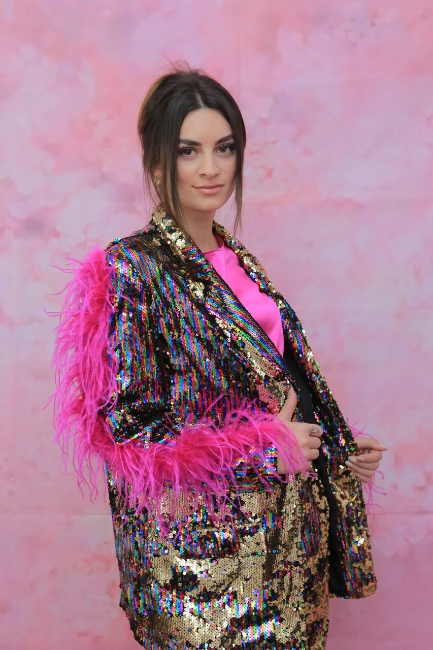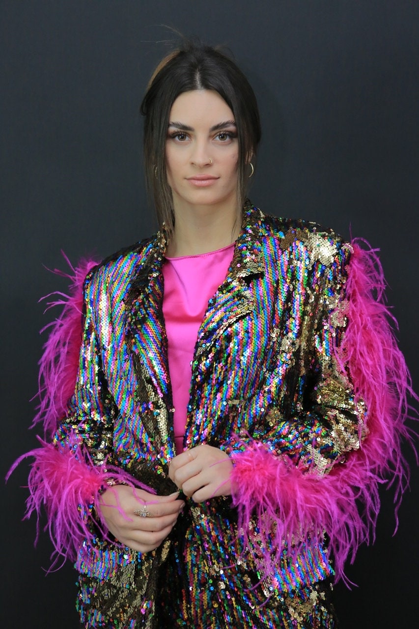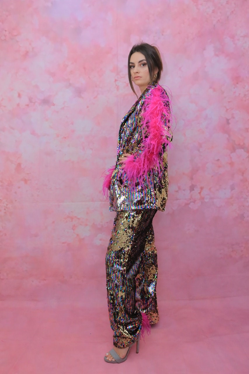 Multicoloured sequin jacket with feathers, trousers and a bright pink under top