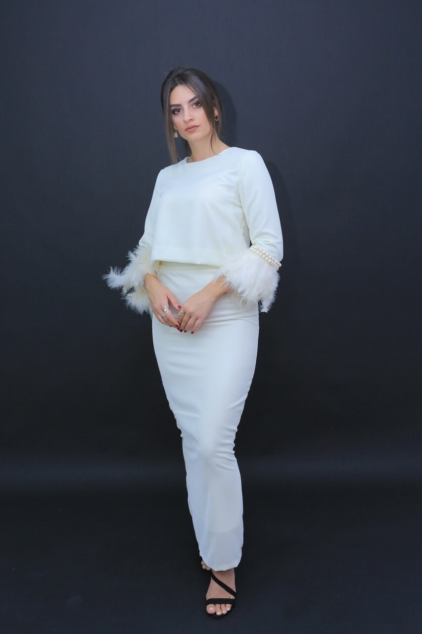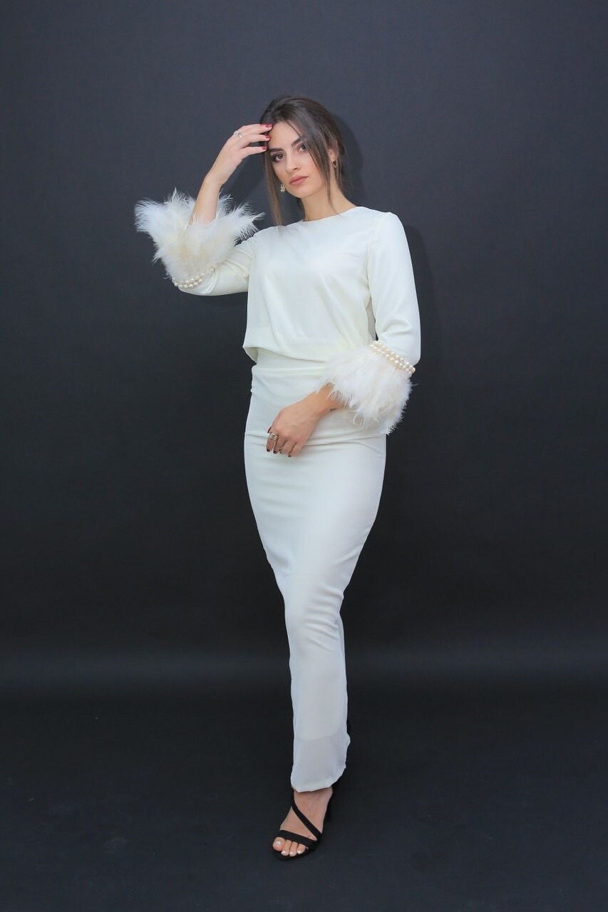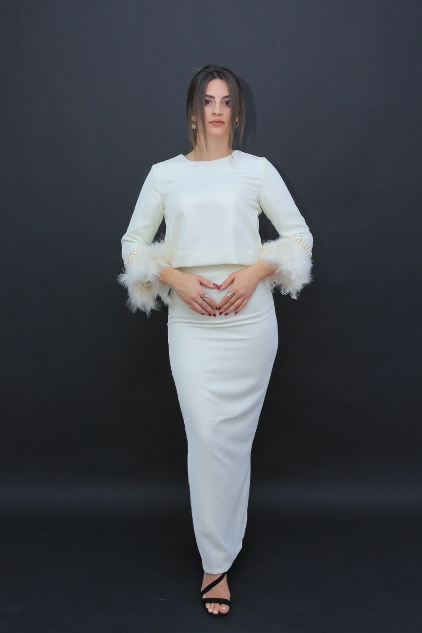 Stunning bridal dress , suitable for weddings and other occasions. Two piece suite, white pencil skirt and white top with pearls and feathers on the sleeves.