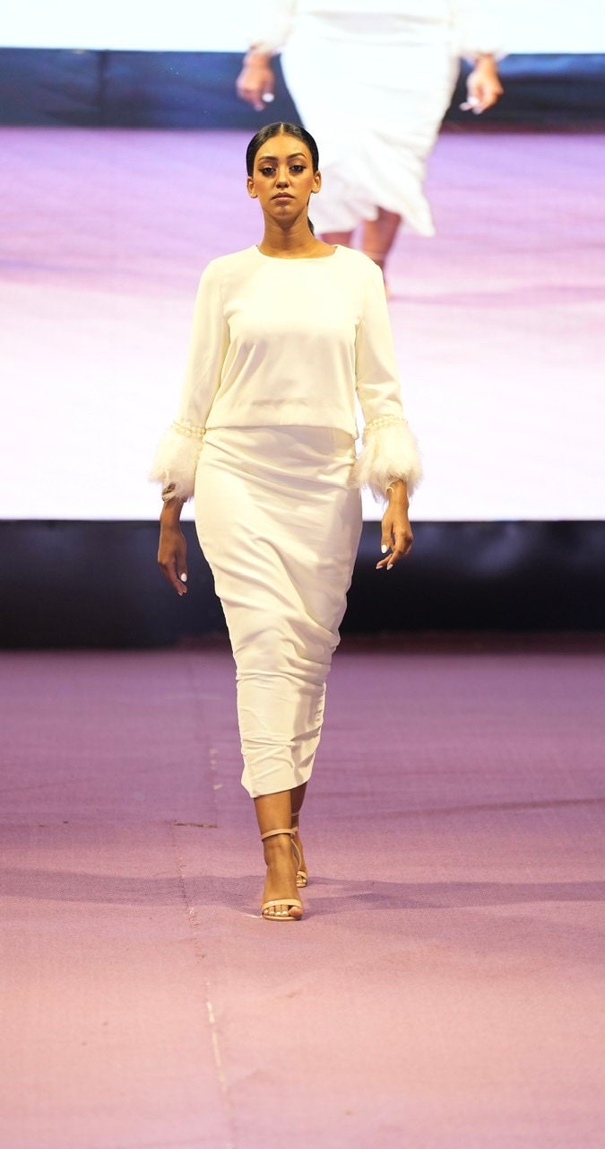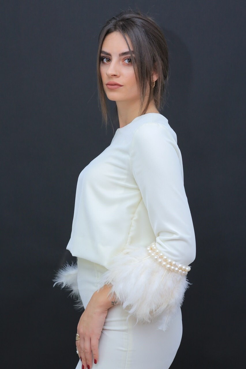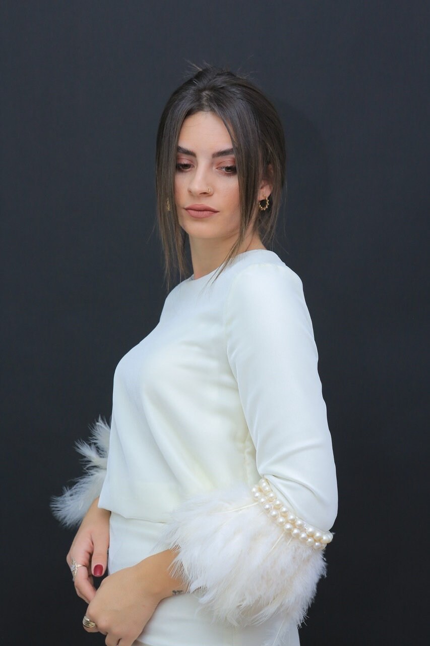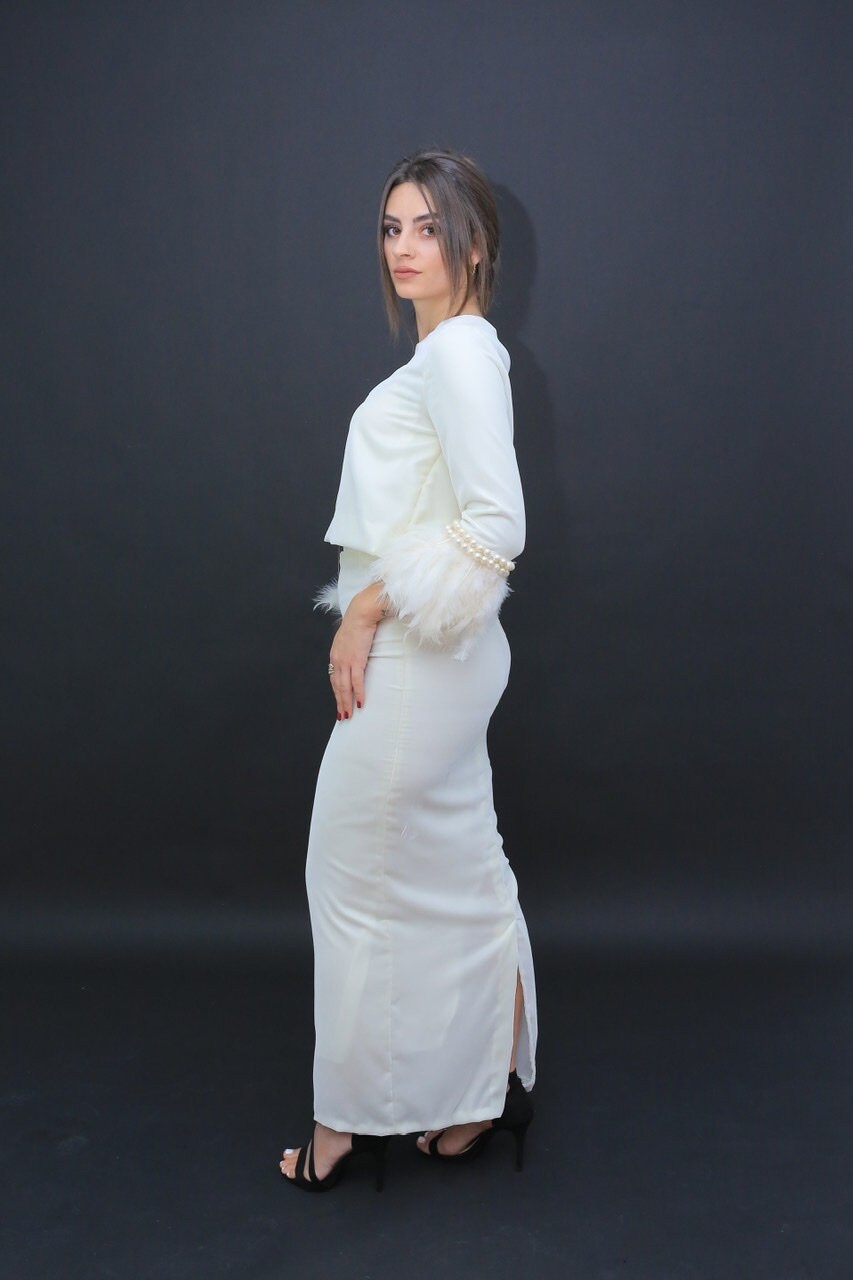 Stunning bridal dress , suitable for weddings and other occasions. Two piece suite, white pencil skirt and white top with pearls and feathers on the sleeves.