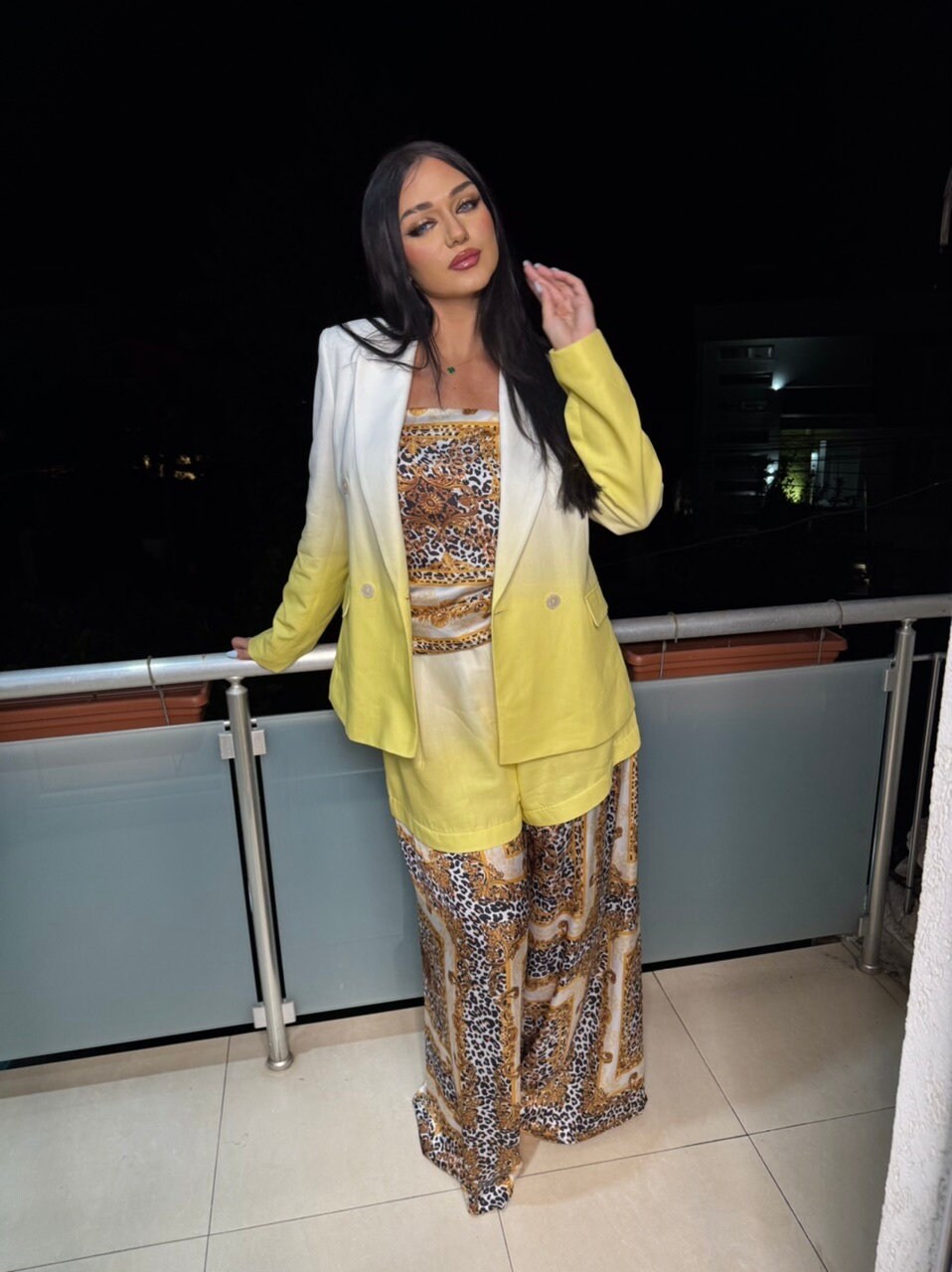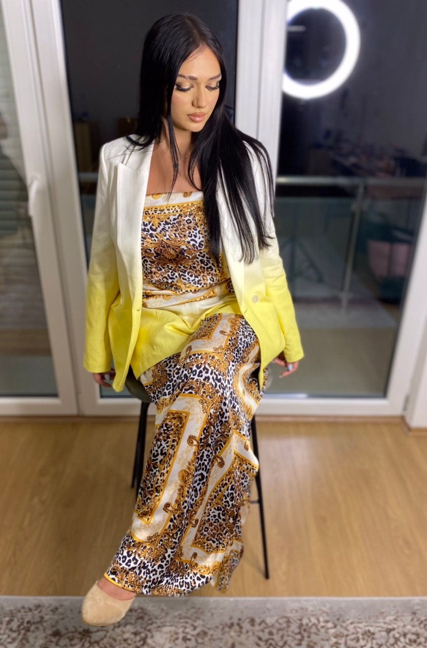 Womens set trousers made from cotton and satin, with beautiful yellow & white plus jaguar satin trousers