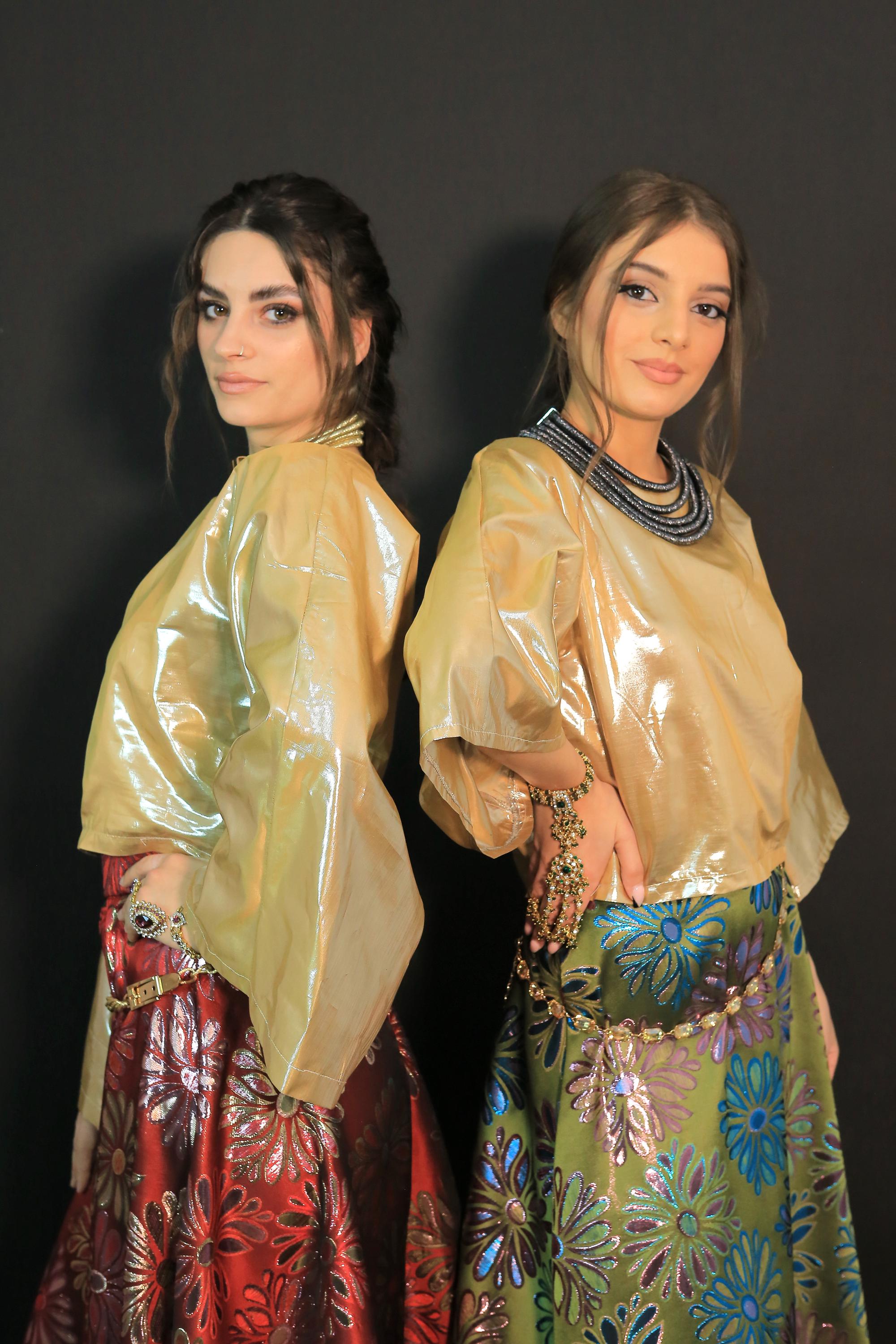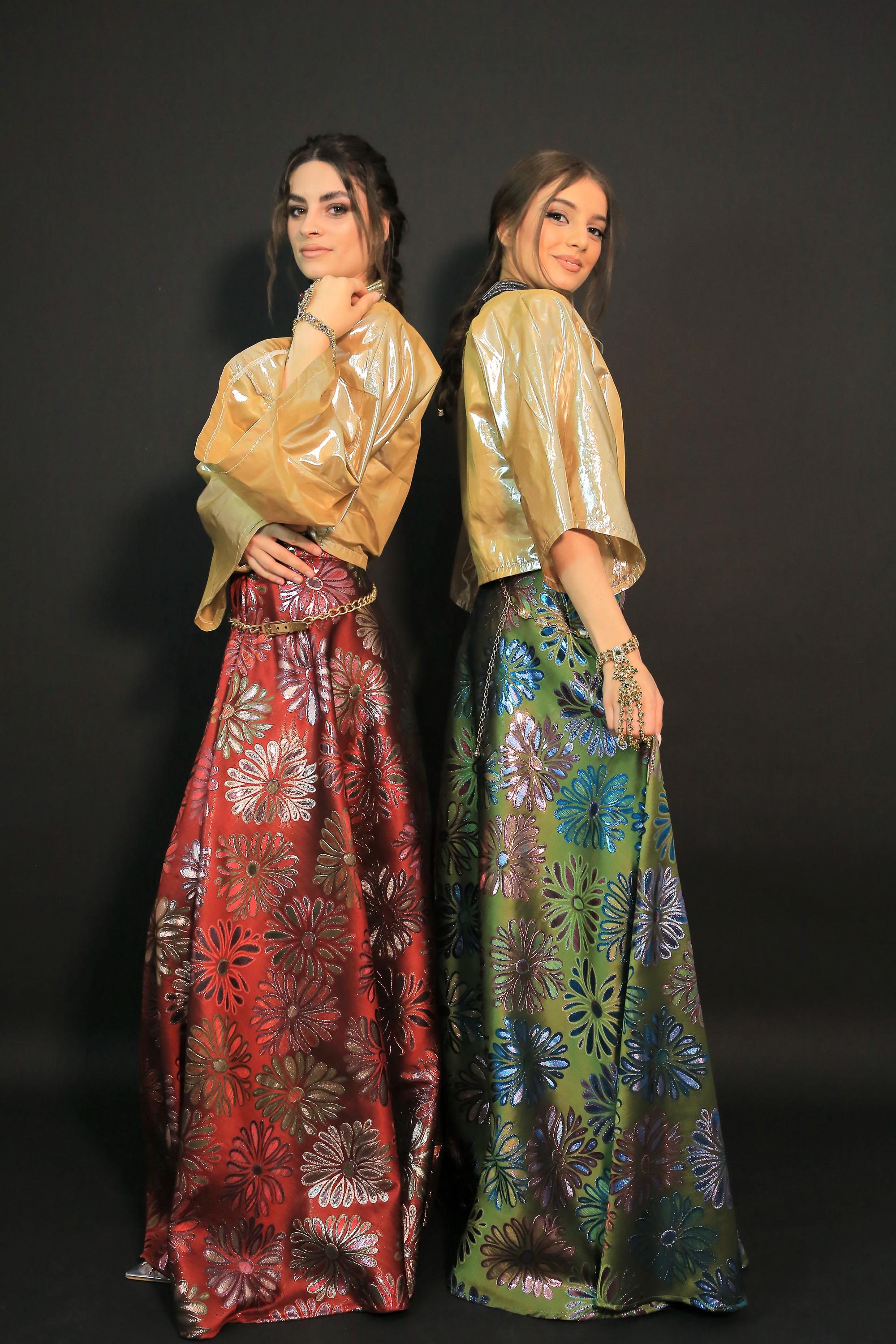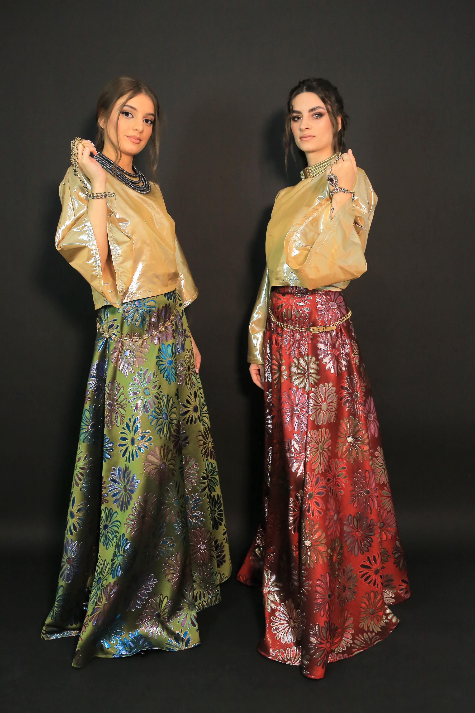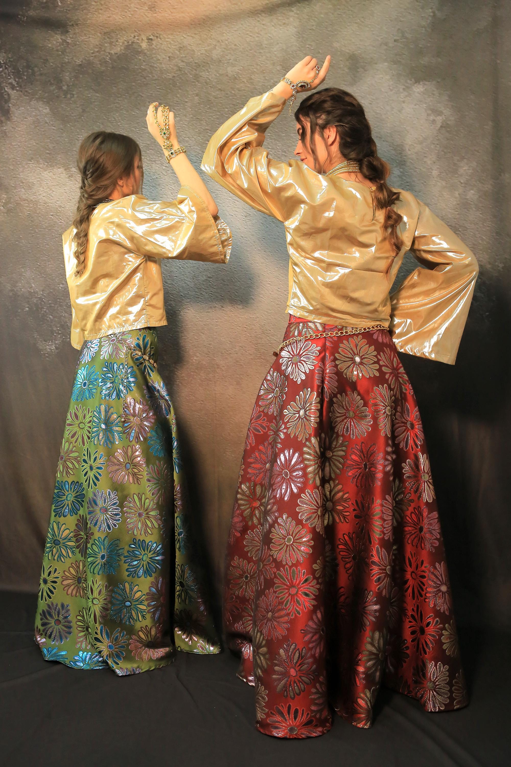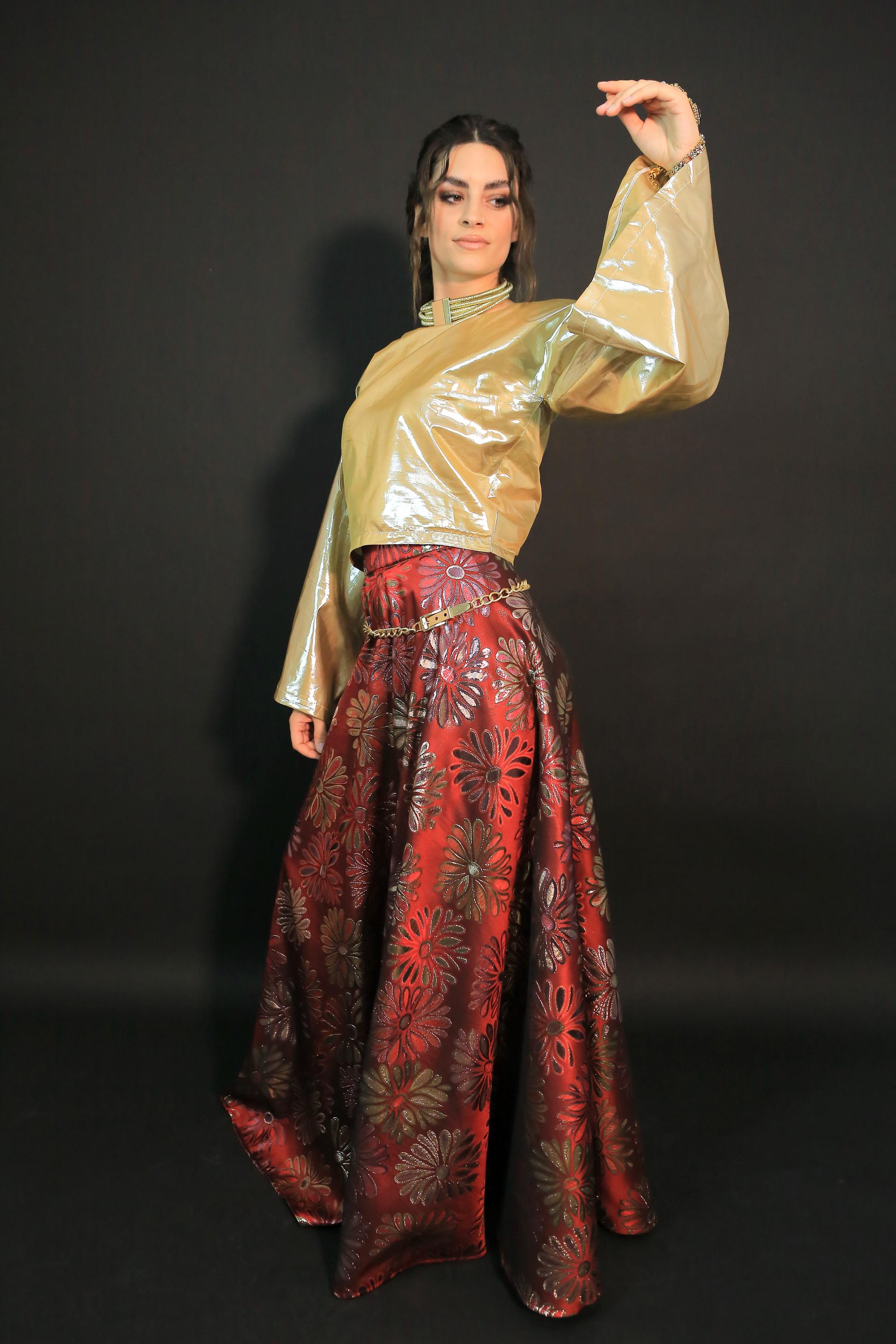Beautiful set skirt with lovely red floral brocade skirt and gold satin top suitable for evening and parties