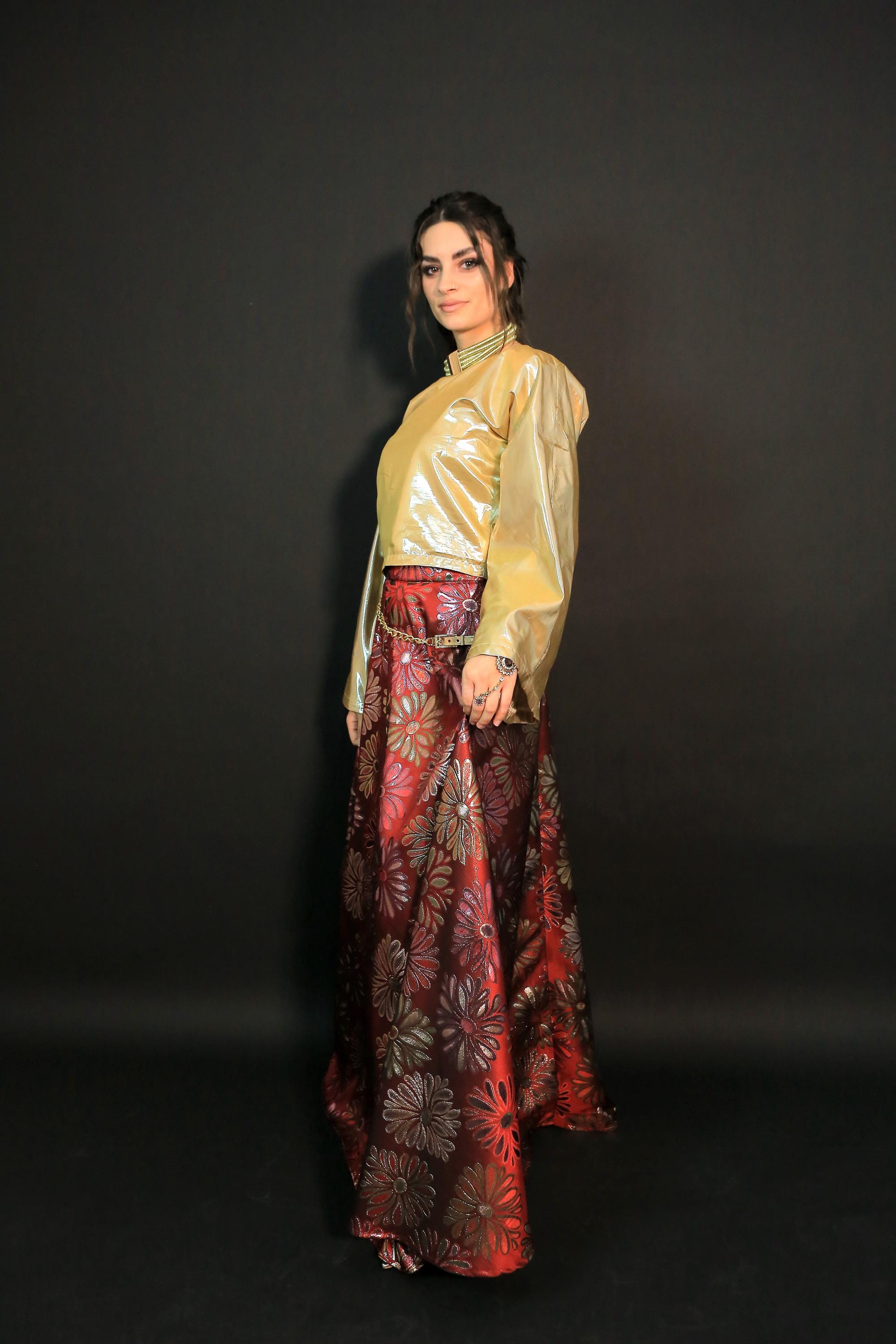 Womens High Waisted A-line Swing Maxi Skirt Floral Brocade with Gold Satin Top
