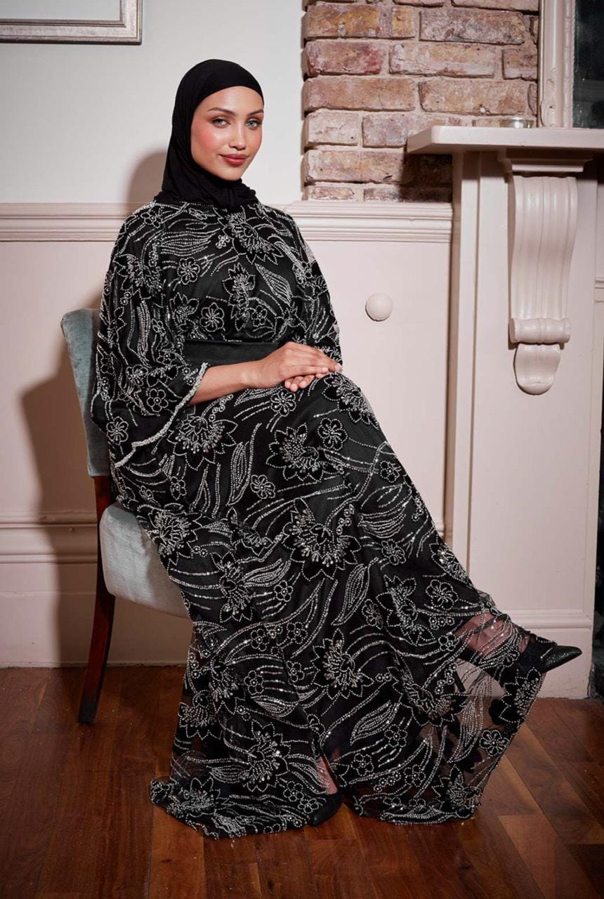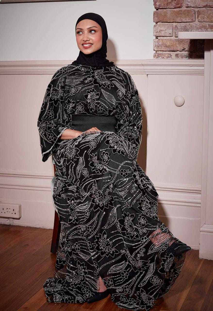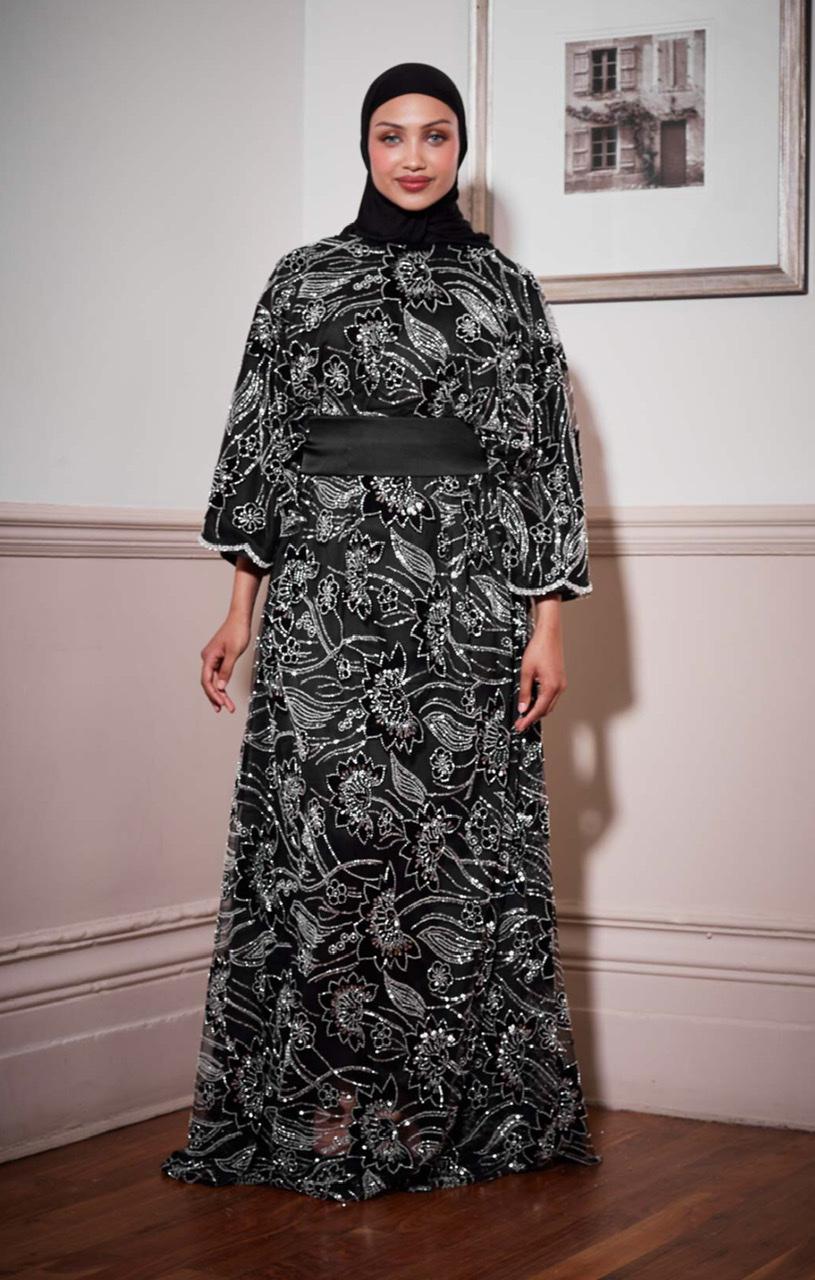 Stunning embellished maxi dress with intricate beadwork, flattering black satin belt.Floor-length silhouette with a graceful flow. Also in Red & Burgundie colour.