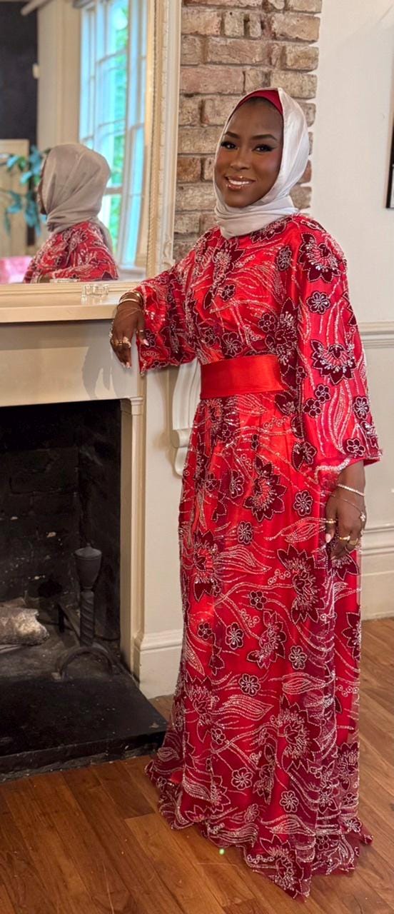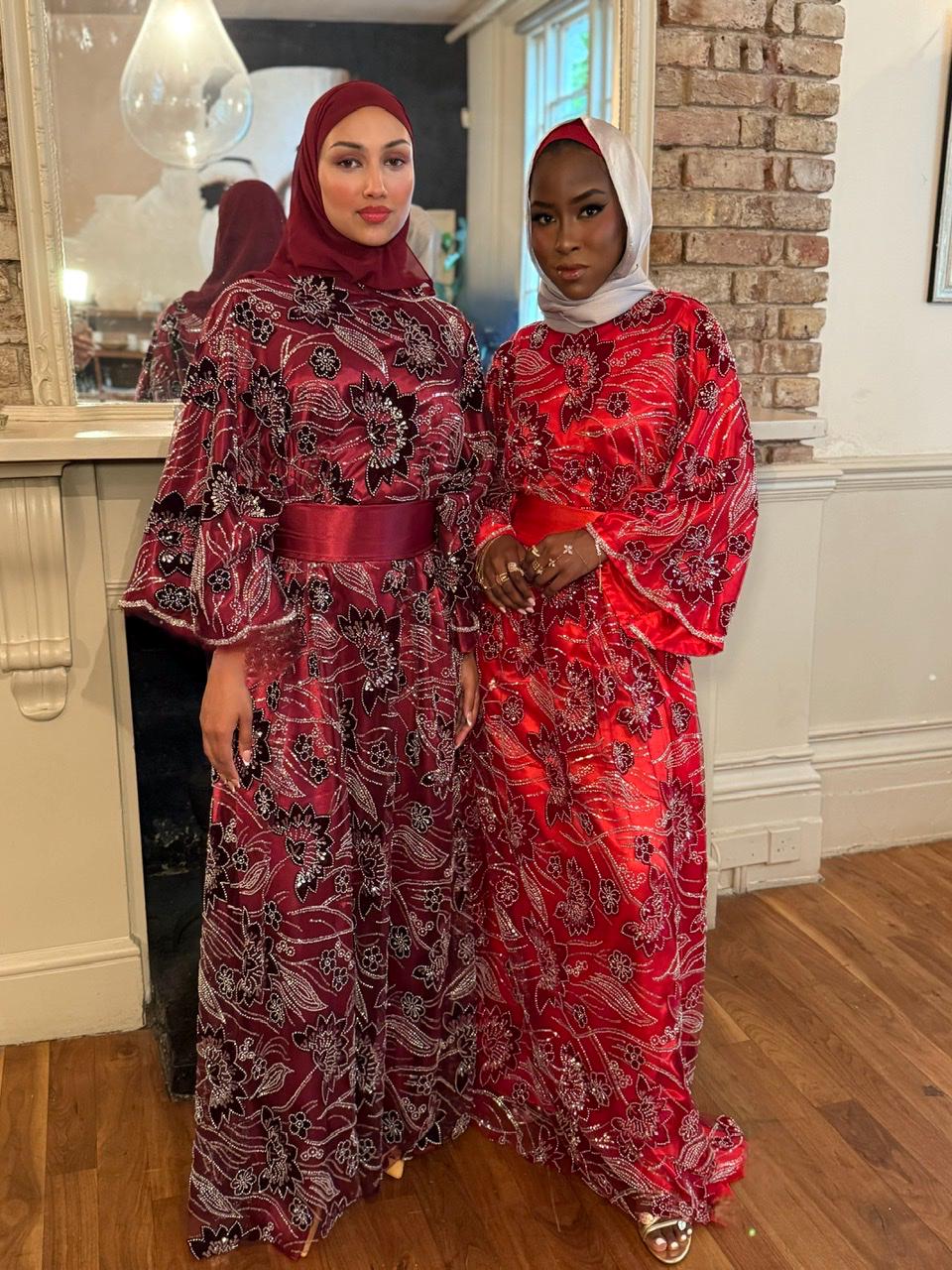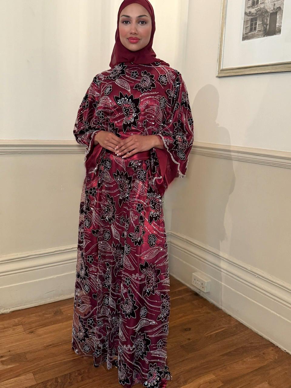 Stunning embellished maxi dress with intricate beadwork, flattering black satin belt.Floor-length silhouette with a graceful flow. Also in Red & Burgundie colour.