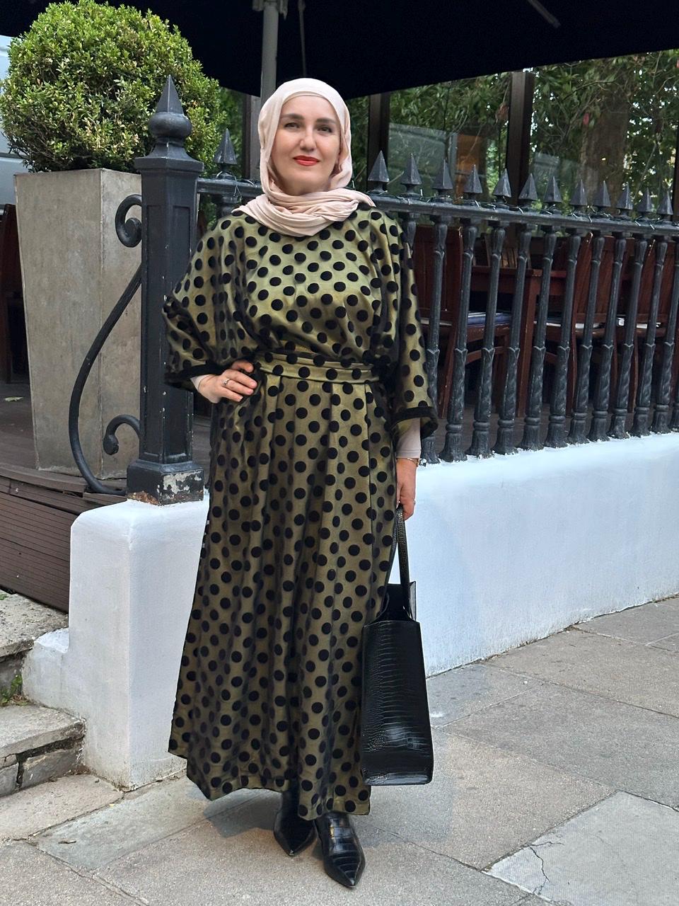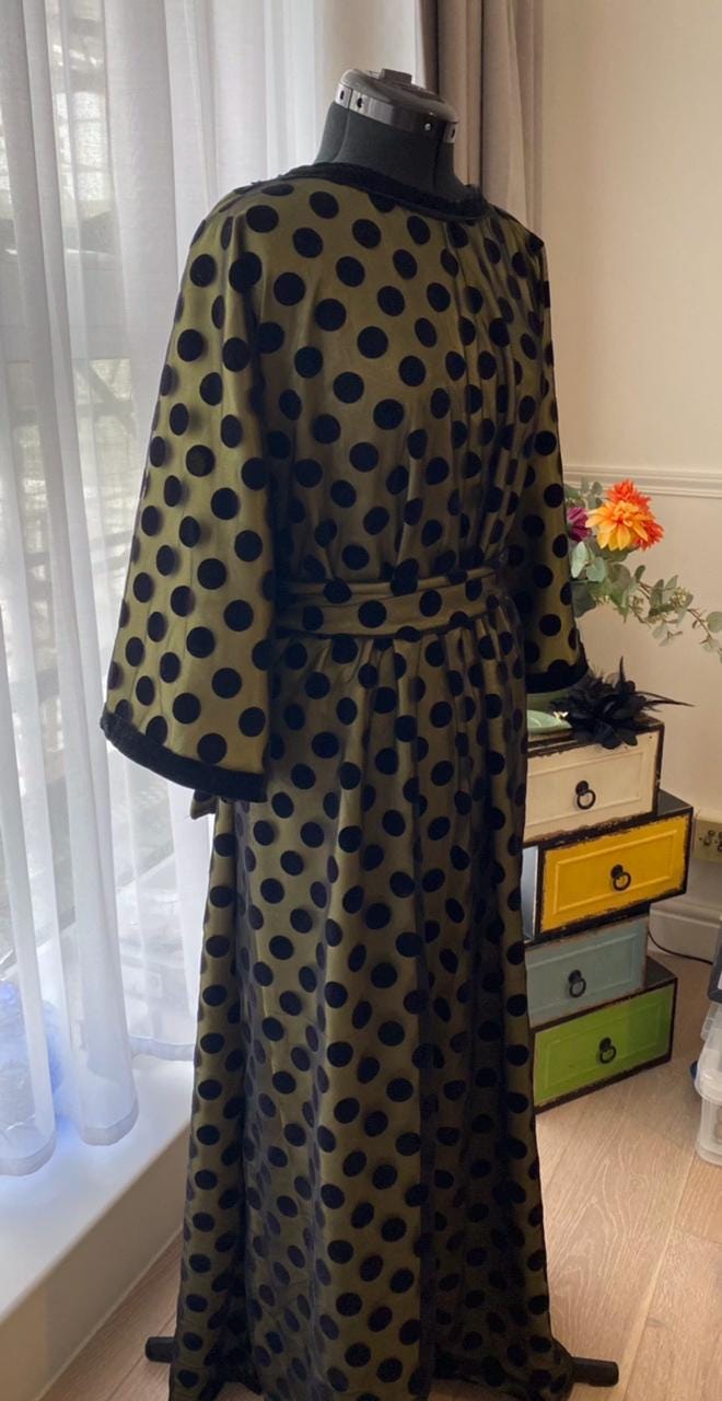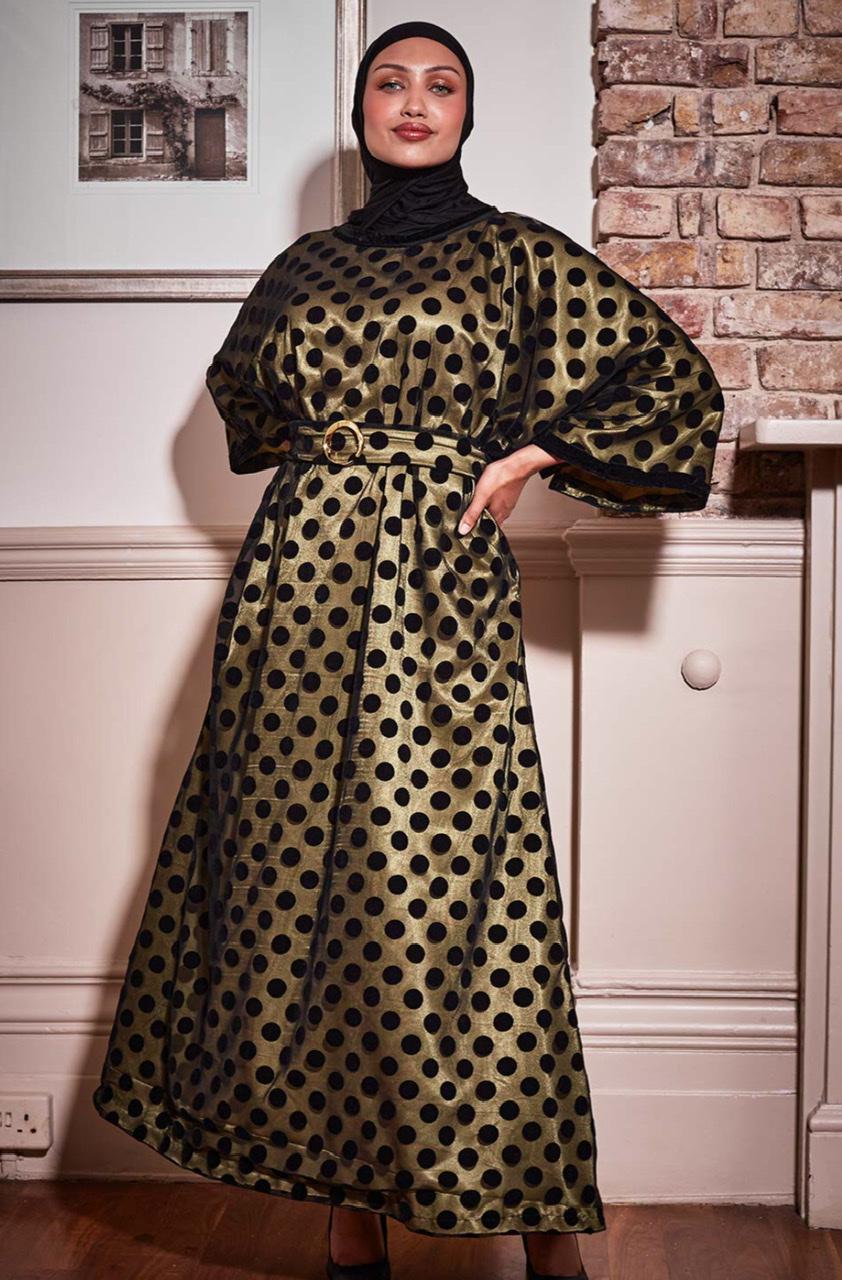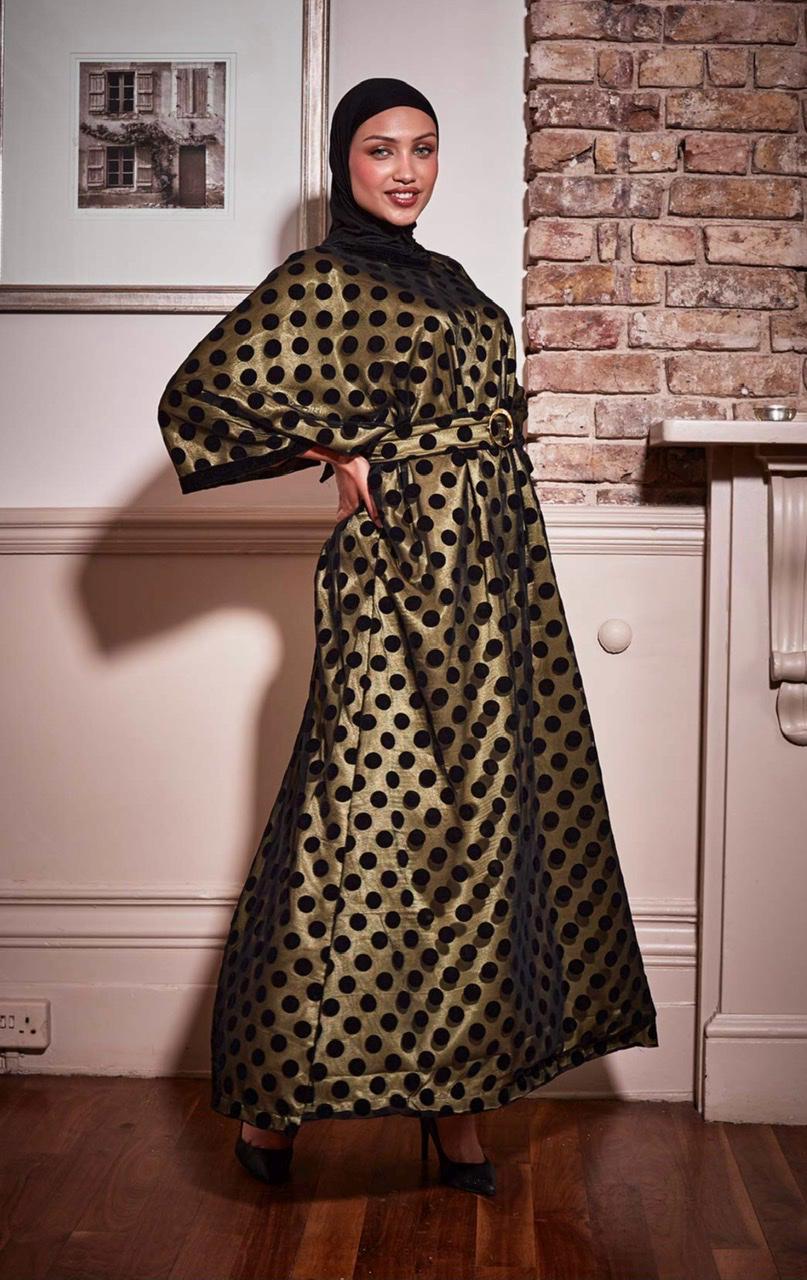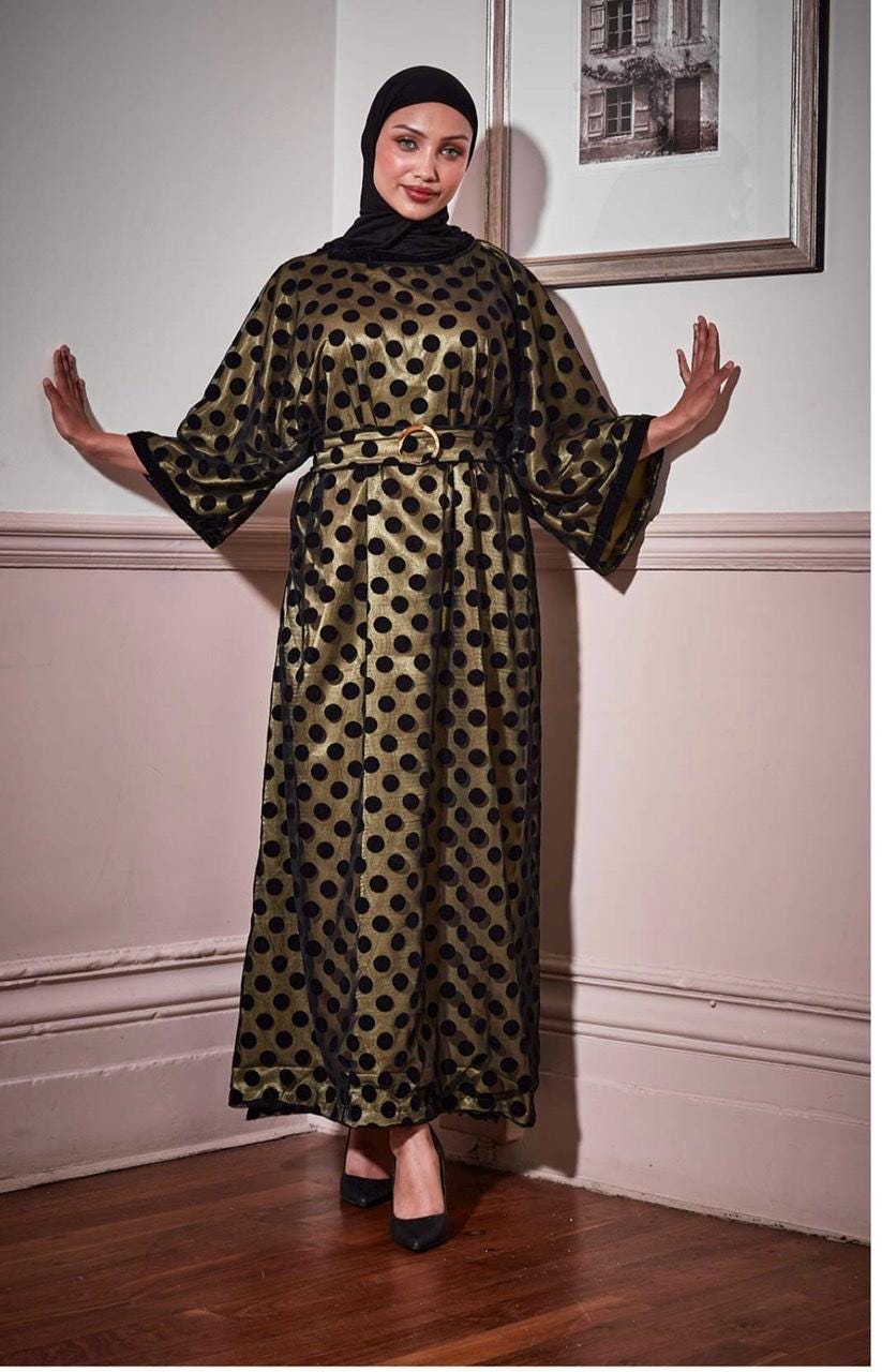 Classic sophistication with belezza Polka Dot Ascot Dress, with A-line Sleeves featuring awaist-defining belt, black & green maxi dress that blends timeless charm with modern elegance, it’s perfect for weddings and special occasions.