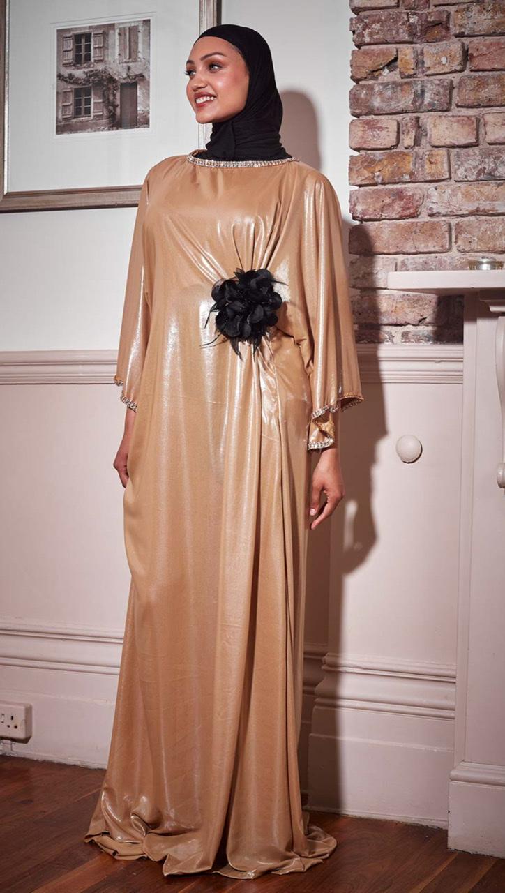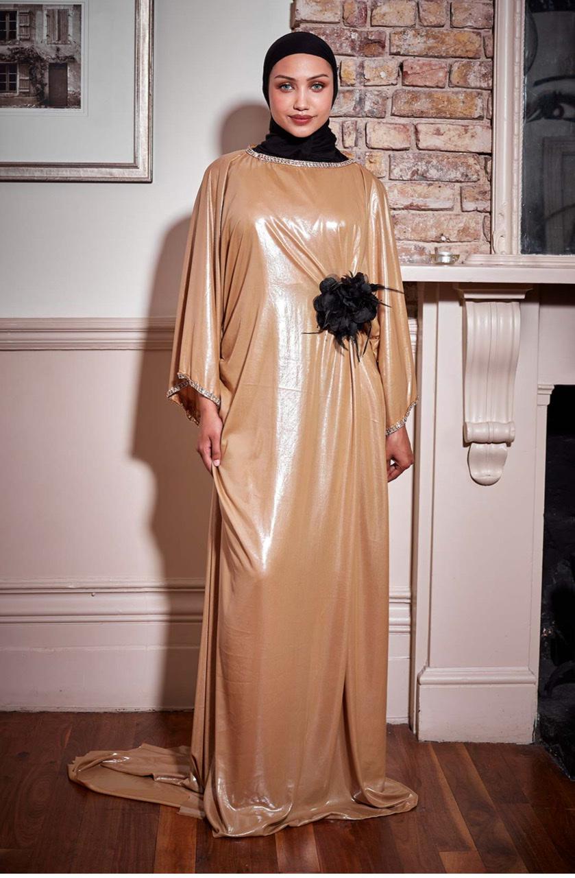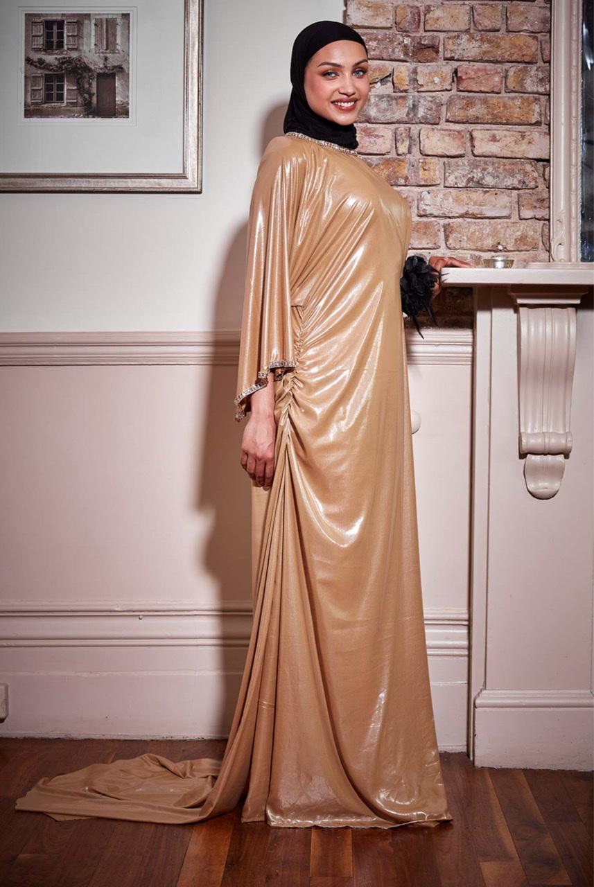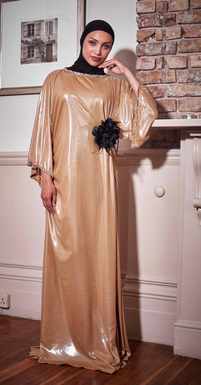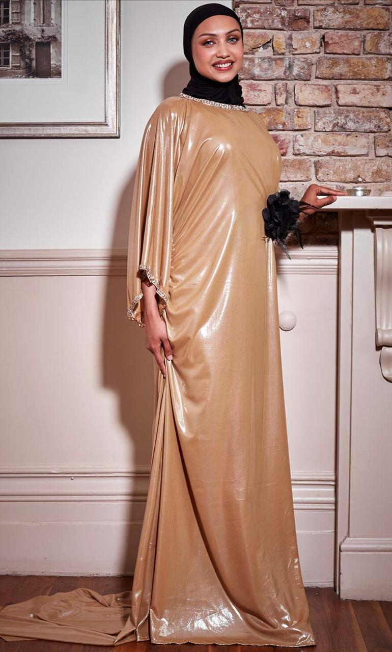 This evening gown is designed for those special occasions where elegance is essential. The sleek silhouette flatters the body, while the long sleeves and neck are finished with gold crystal appliqué and floor length mermaid dress.