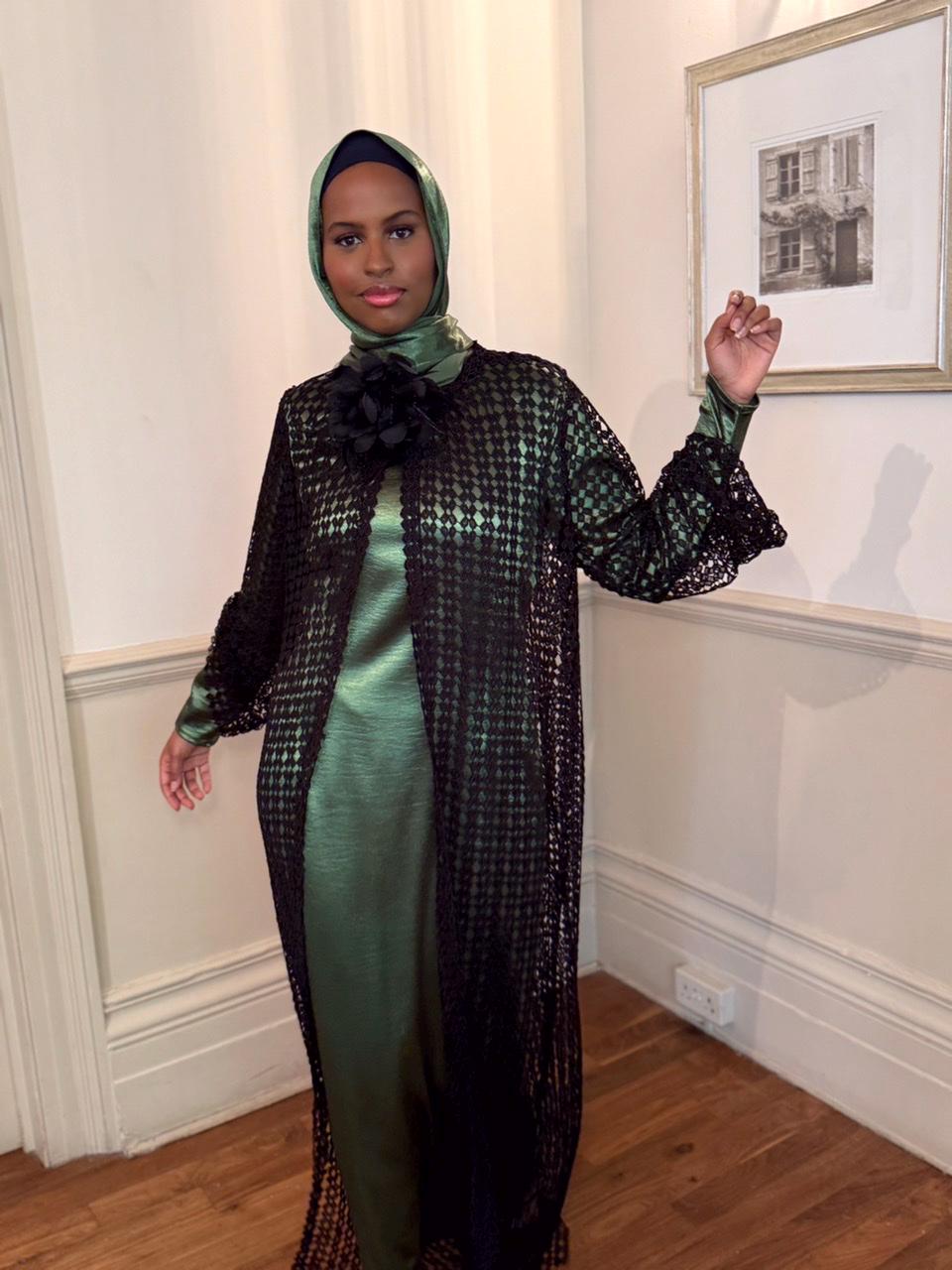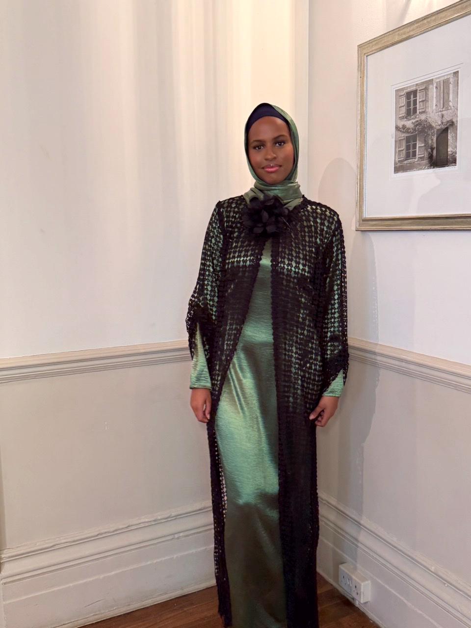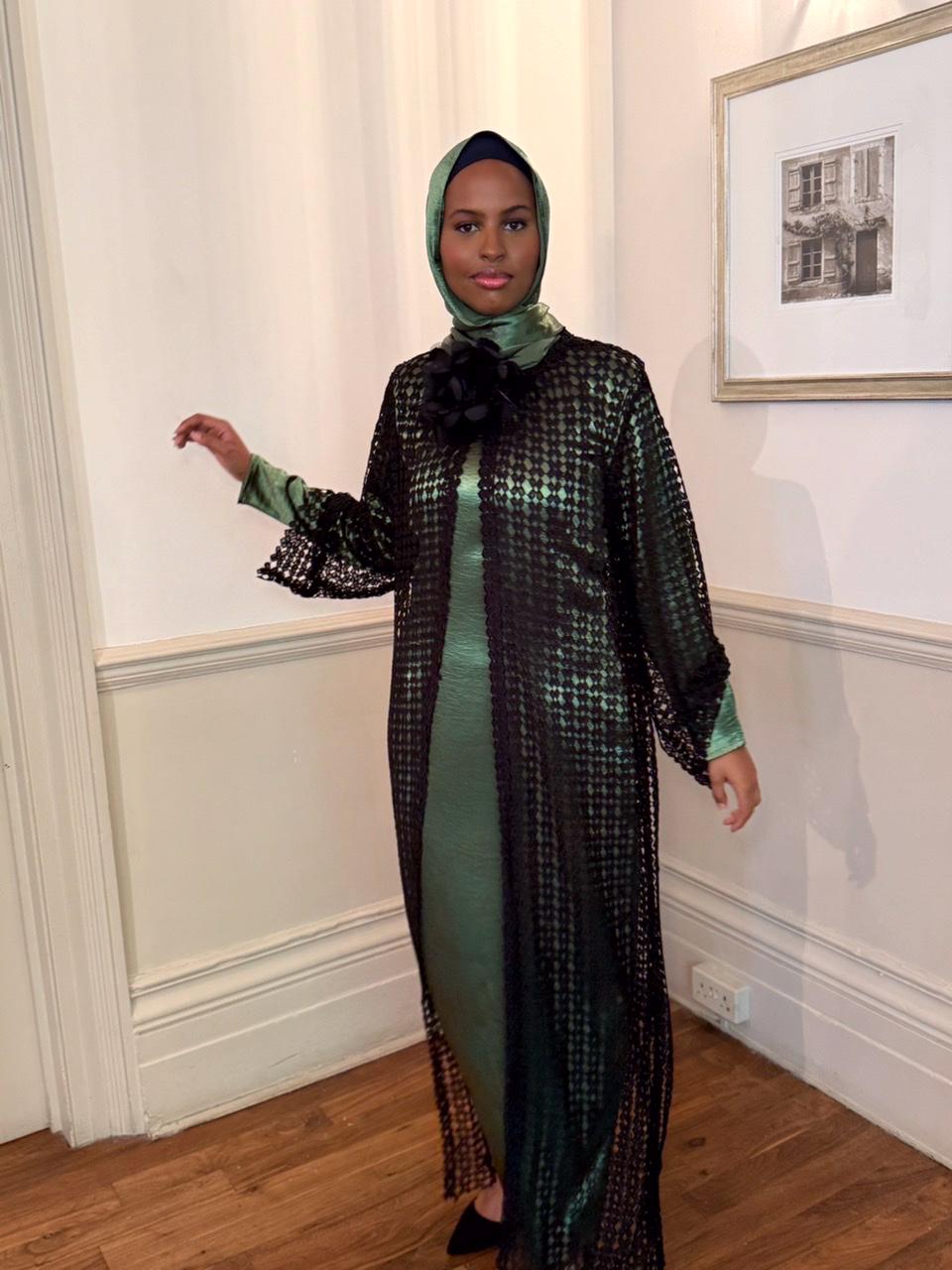 Green Satin slip dress with long black blazer perfect for weddings and other events and green scarf.