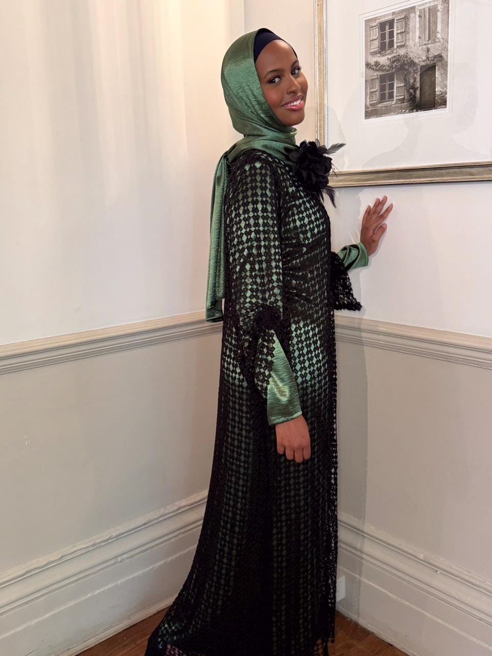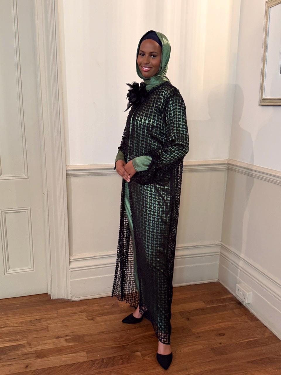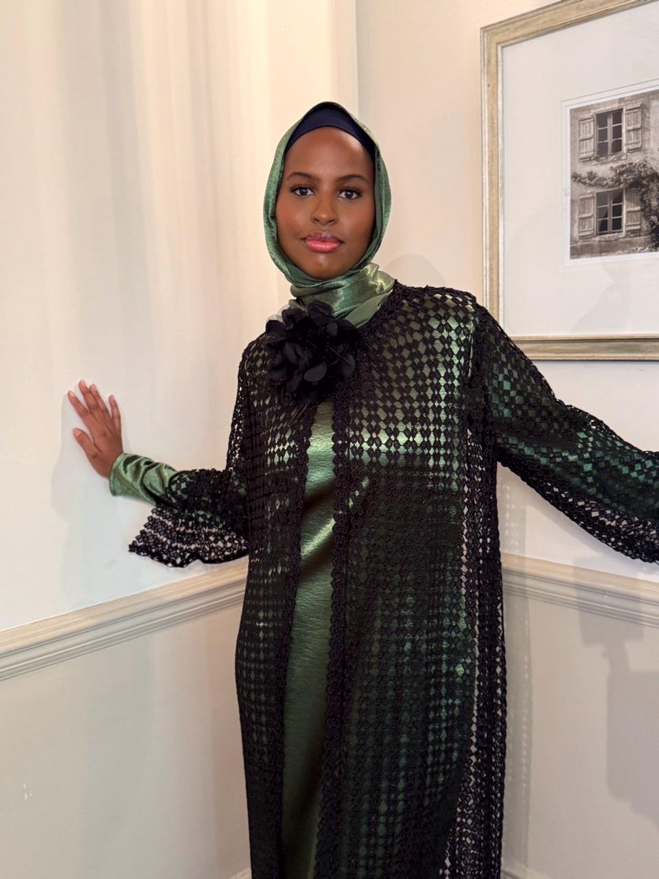 Green Satin slip dress with long black blazer perfect for weddings and other events and green scarf.