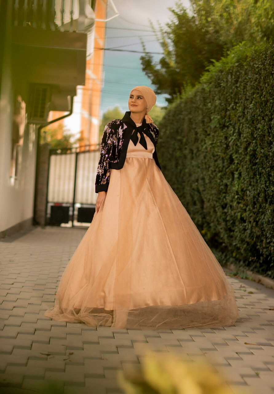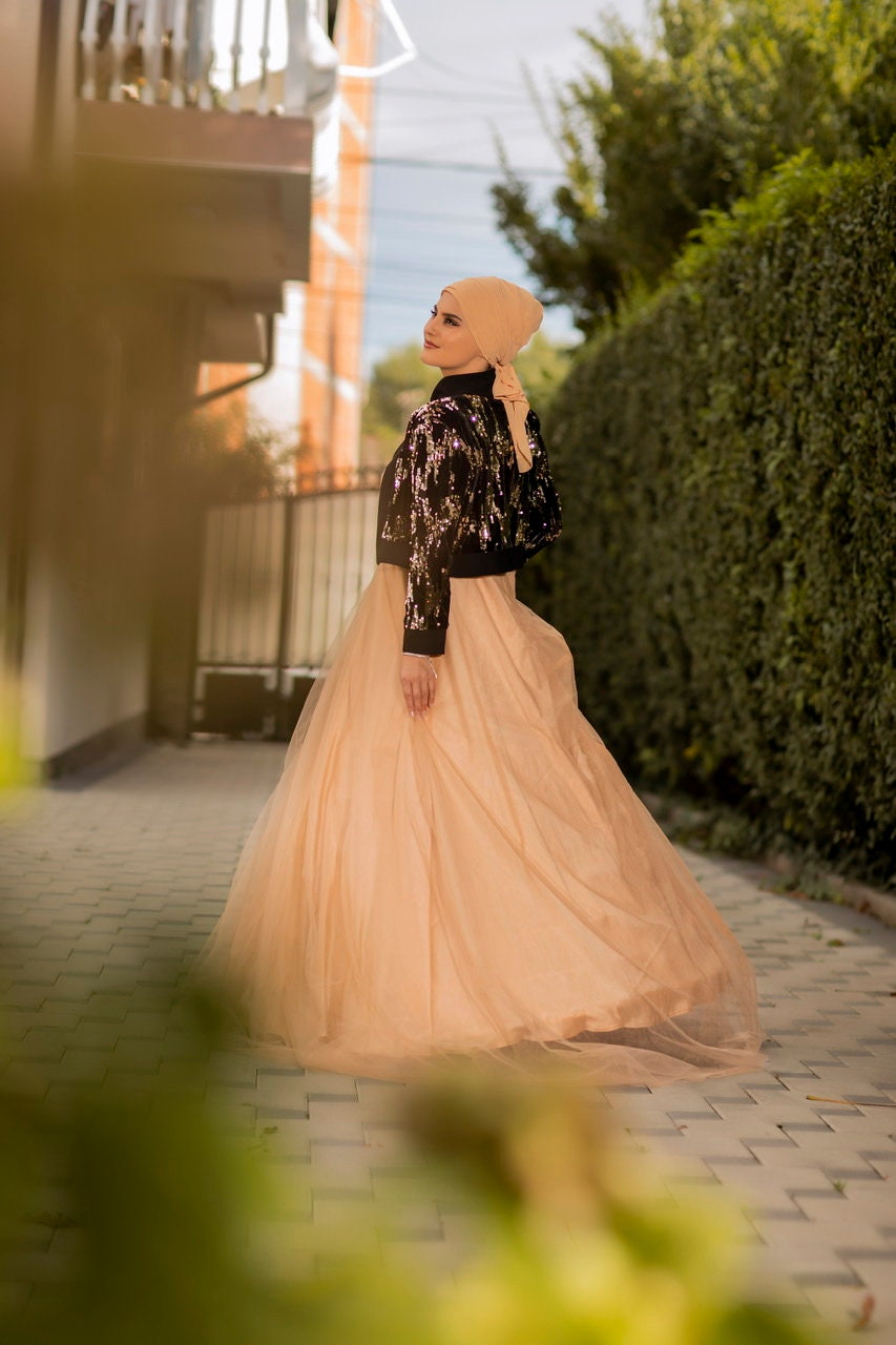 Two piece set dress , Beige Tulle, black, velvety blended sequin, Sequin Jacket, Tulle Dress, Bridal Dress, Two Piece Dress, Maxi Dress,