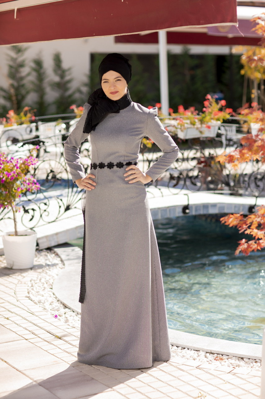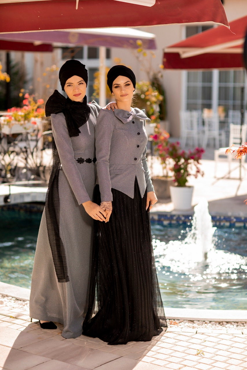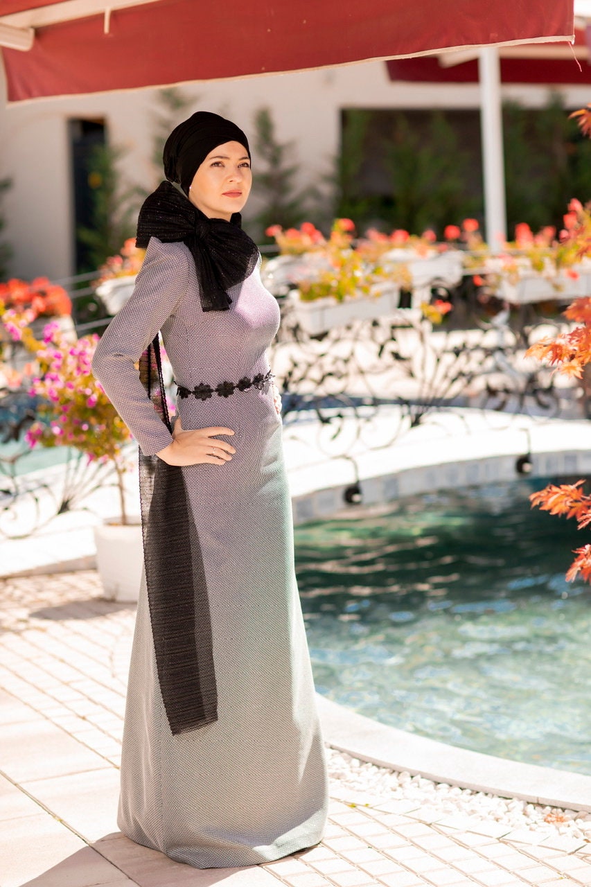 A smart Grey cotton wool and linen blend suiting dress in a black Bow crushed Tulle on the side of the shoulder