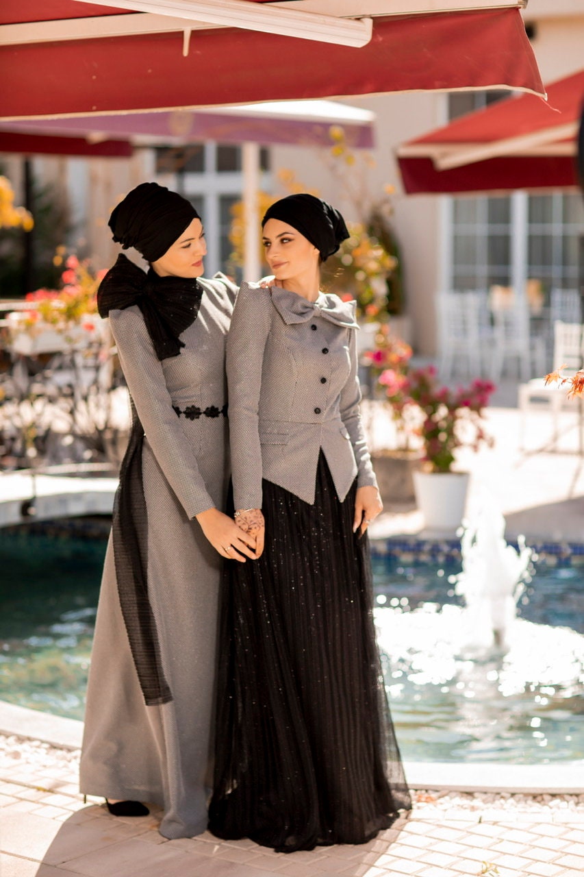 50s Style, Grey Cotton, Wool Blend, Suiting Dress, Crushed Tulle, Bow placed on the shoulder, Maxi Dress, Party Dress, Vintage Dress,
