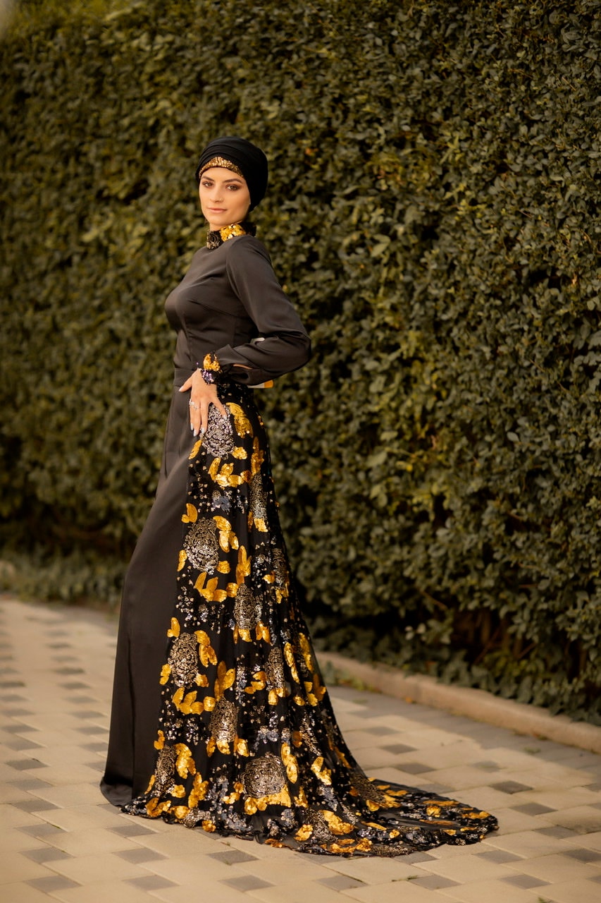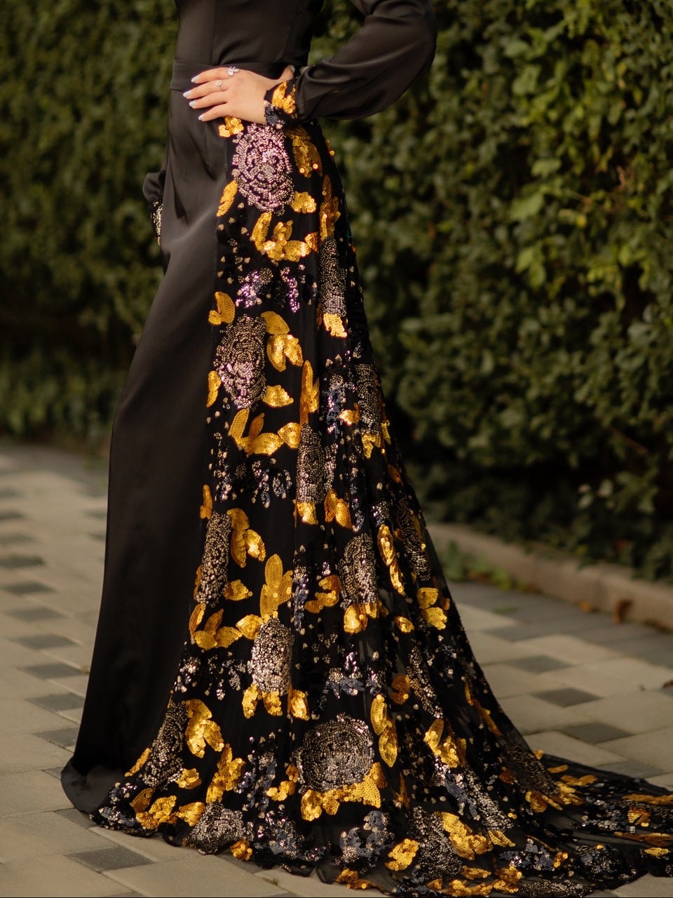 Elegant black satin dress overlay gold sequin skirt in mermaid dress