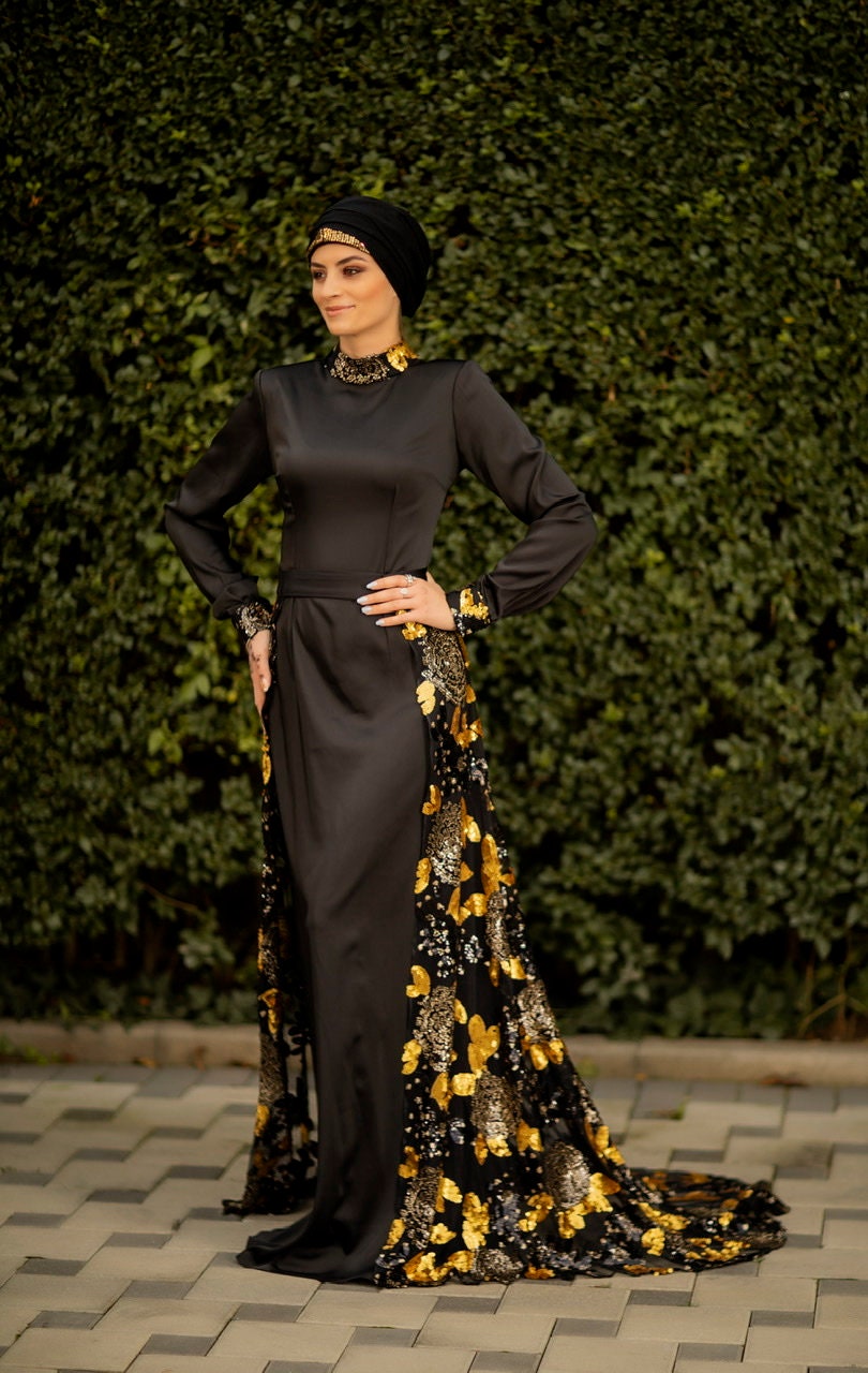 Black Satin Dress Overlay Sequin Skirt/ Black Satin Dress/ Floral Dress/ Evening Dress/Bridal Dress/ Maxi Dress/ Modest Dress/