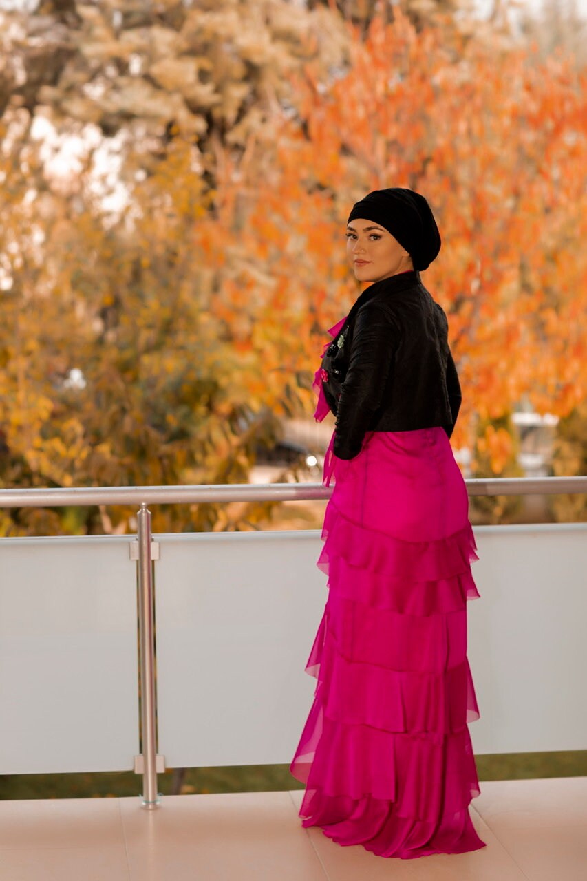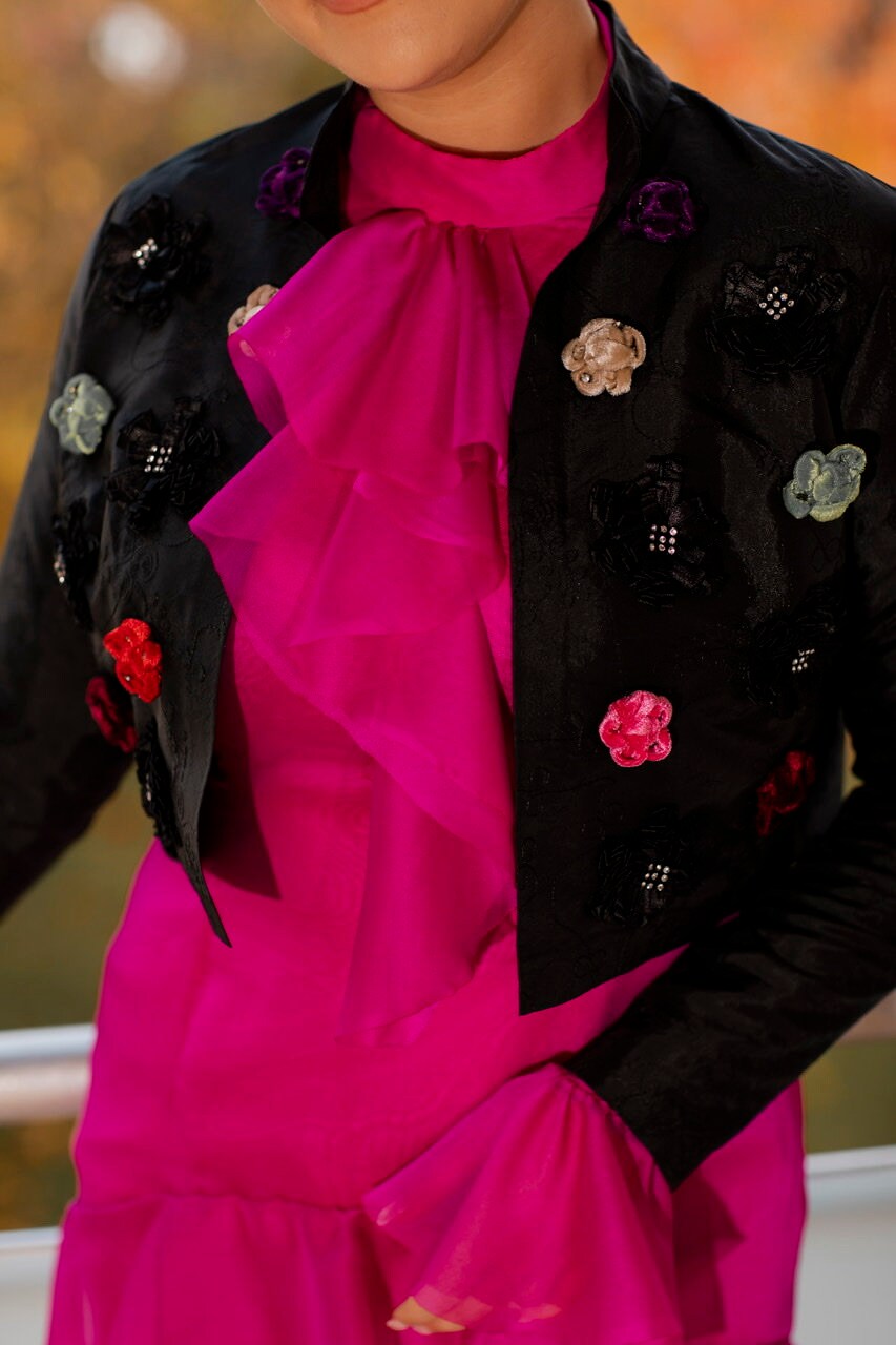 Beautiful hot pink long dress in a black bolero with floral appliqué