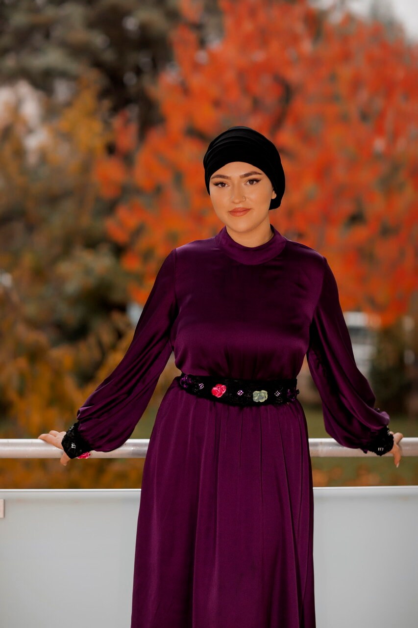 Purple Satin Tunic, Bishop Sleeve Elegant long sleeve Floral Belt, plain Satin trousers