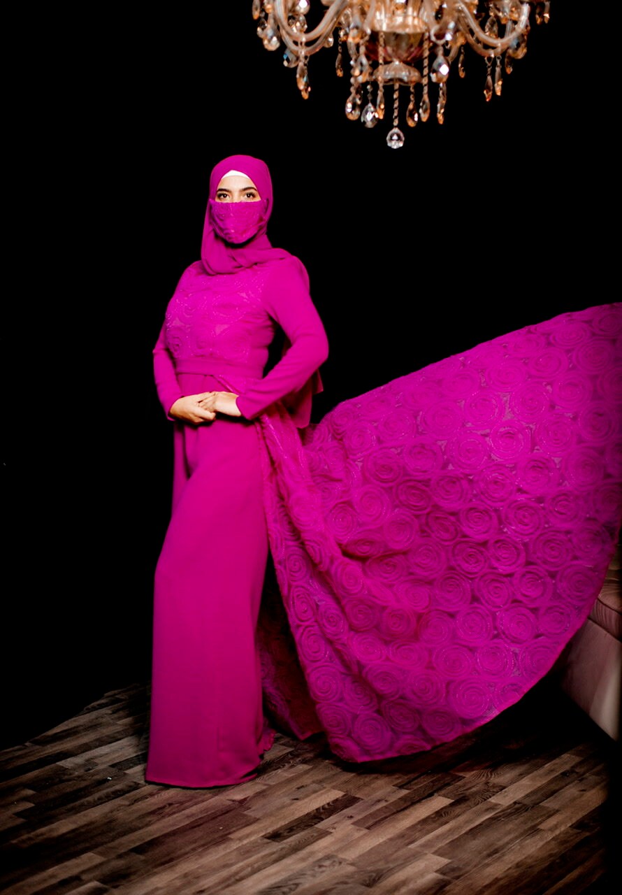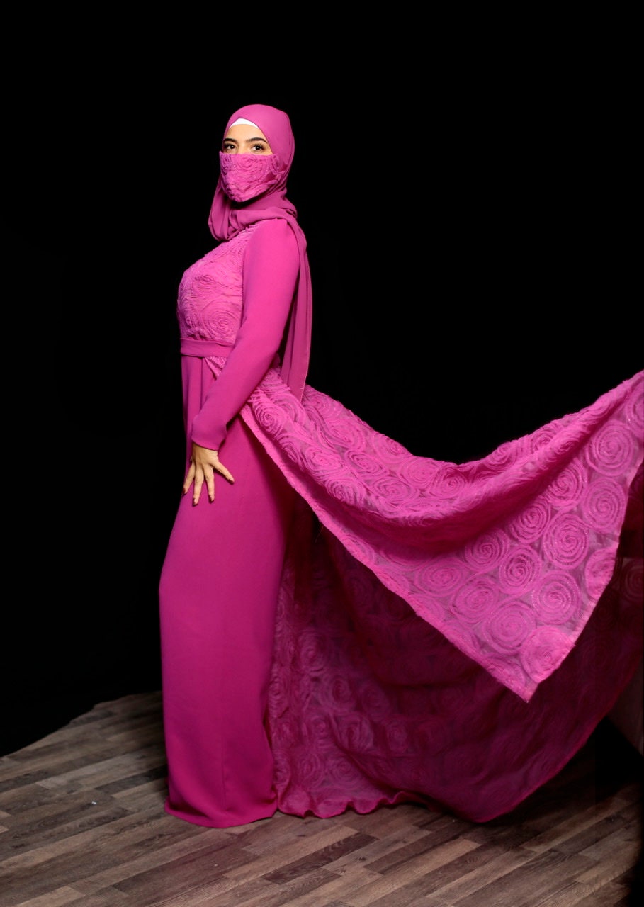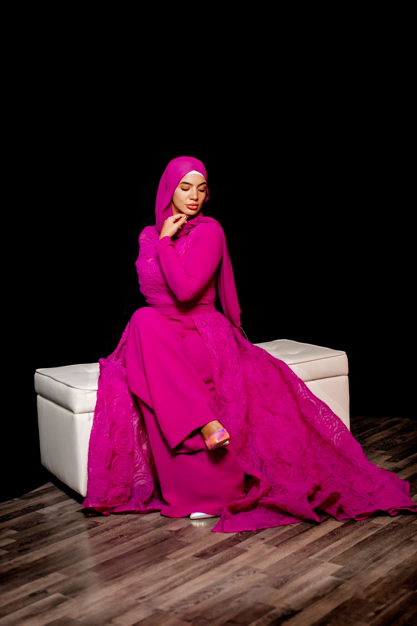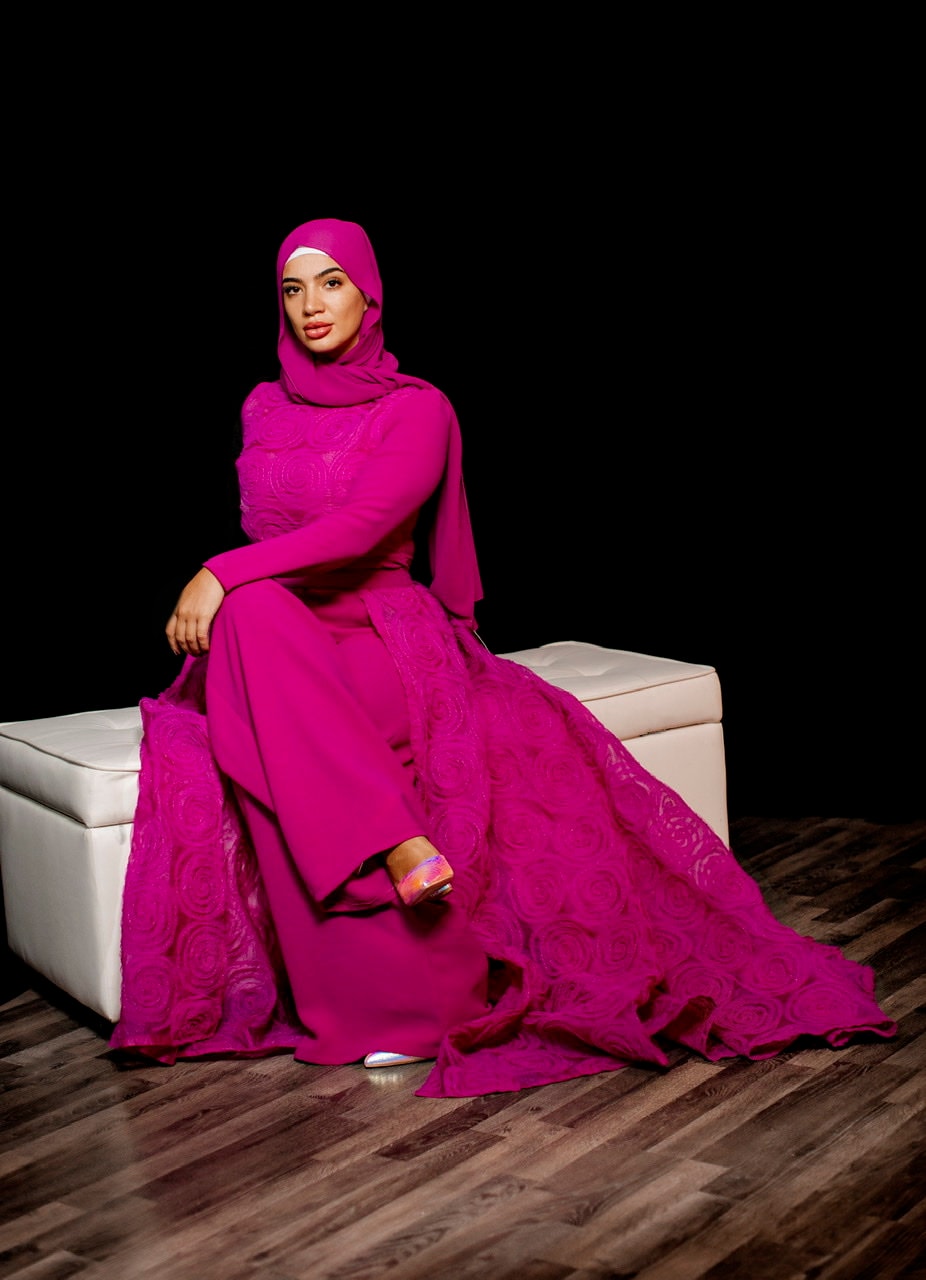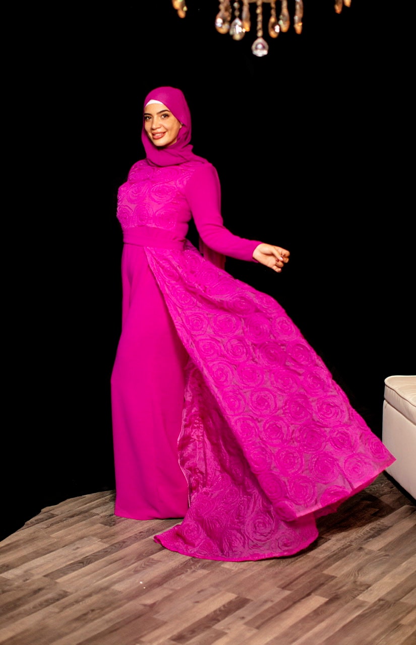 The most stunning two piece set in a hot pink jumpsuit overlay tulle floral skirt , the best fabrics from Joel&Son stores