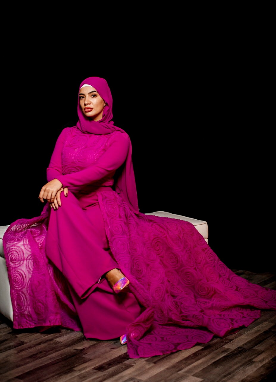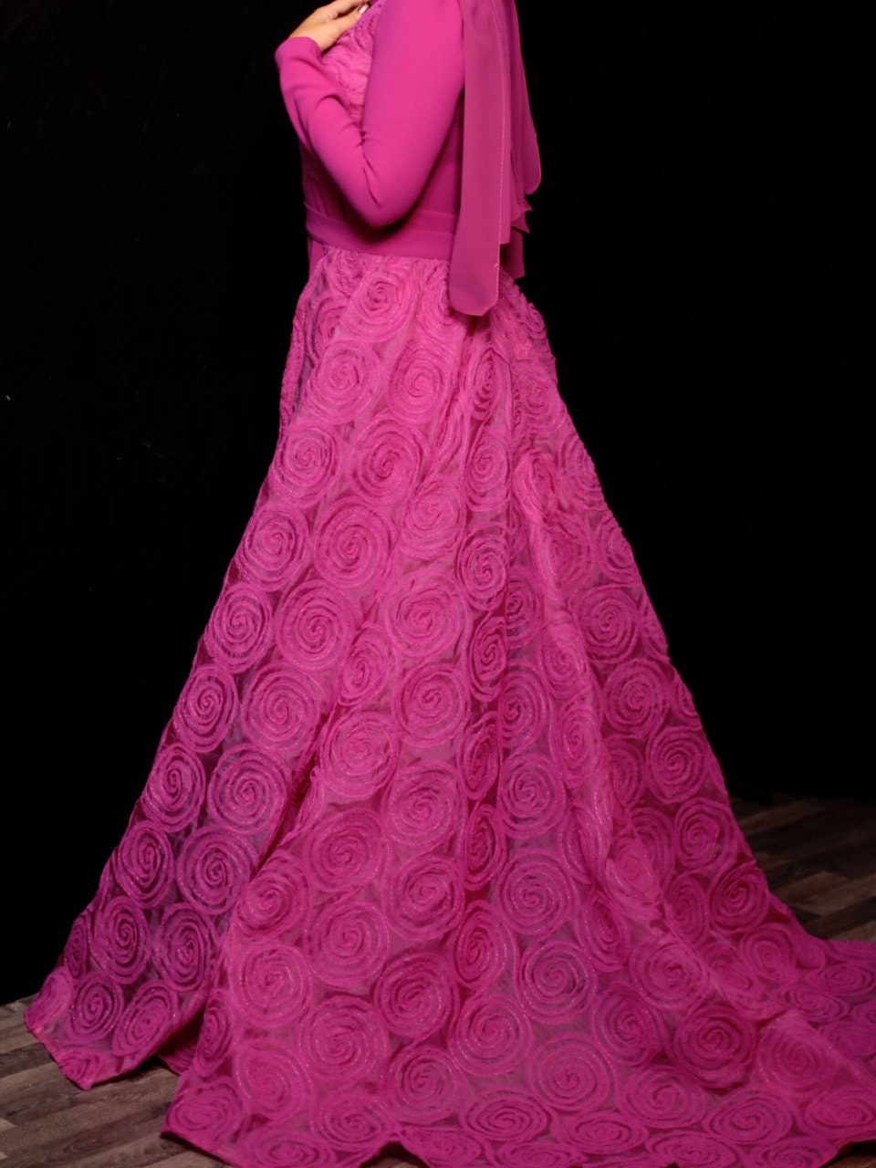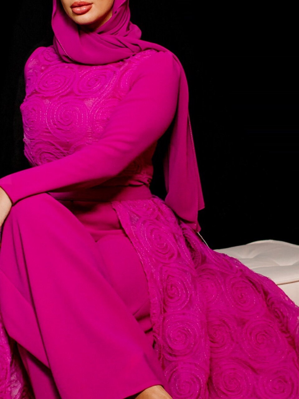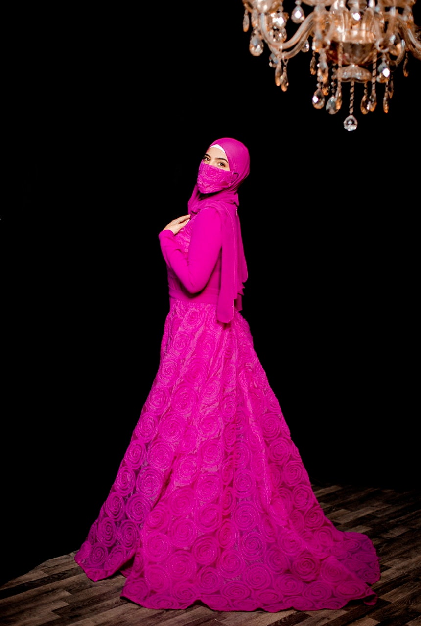 The most stunning two piece set in a hot pink jumpsuit overlay tulle floral skirt , the best fabrics from Joel&Son stores