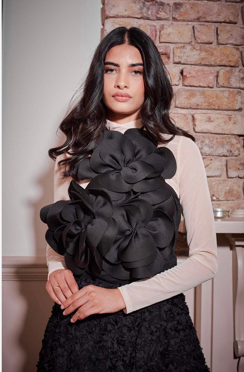 Beautiful two piece set in a black embroidered georgette with a grey top